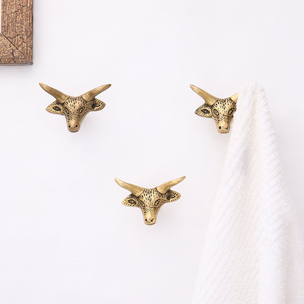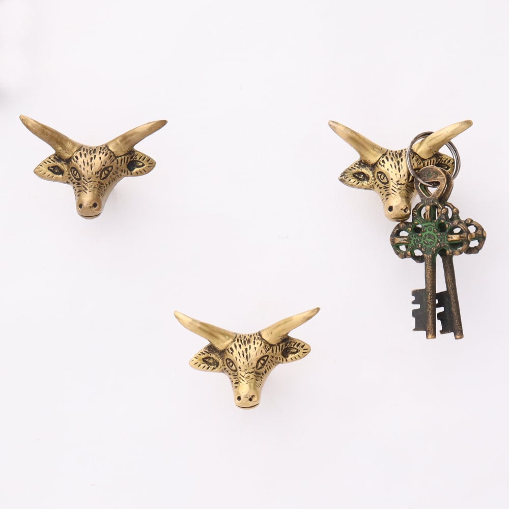 • Brass Steer Head With Horns Wall Mounted Coat Hooks- Pack of 3