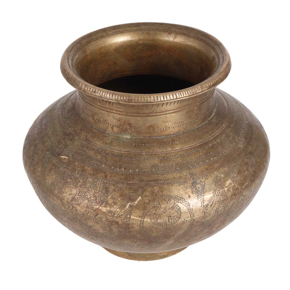 Buy an engraved water pot made of high quality brass, handcrafted by skilled Indian artisans from South India. This traditional, sturdy looking water pot is engraved with beautiful motifs, making it an exceptional decorative piece. It has a dark brown finish in vintage style. Being made of brass, it spreads positive energy in the environment when placed in the north or east of the house, offices, hotels, restaurants or cafes. Since ancient times, water pots have played an important role in Hindu rituals and havans to store sacred water, rice, milk or gold coins. Gift this exquisite piece to your loved ones on special, festive and auspicious occasions.