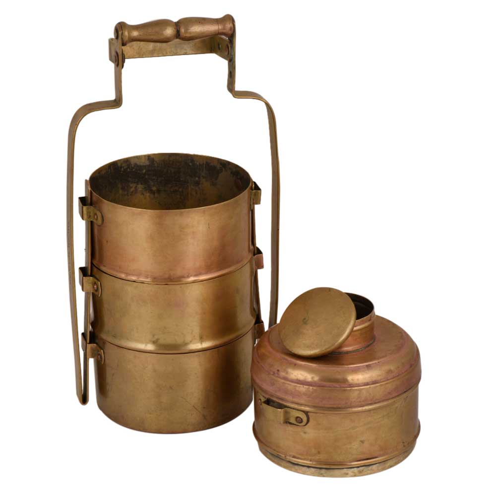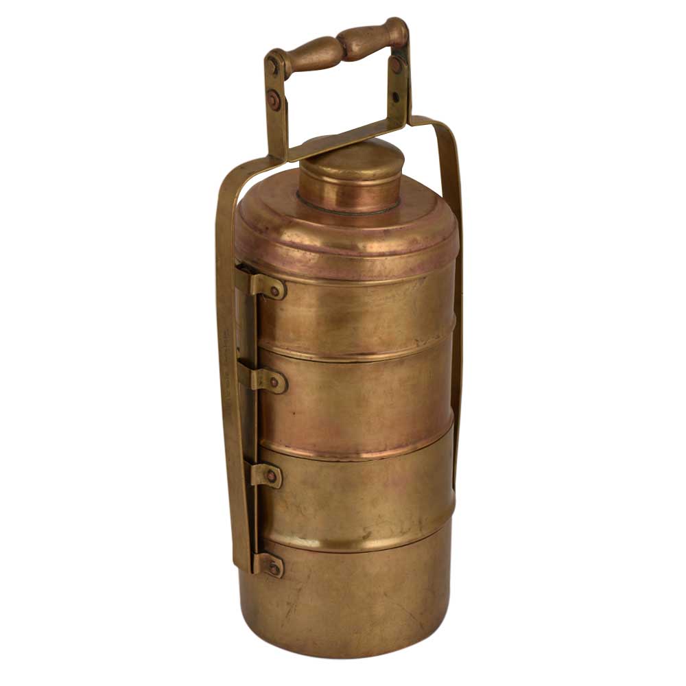 Brass Tiffin Box that has four compartments and thick brass metal frame that has a traditional locking system that keeps all the containers intact. Use it for your personal use, as a showpiece, food presentation by food bloggers, corporate gift or gift for your near and dear ones.