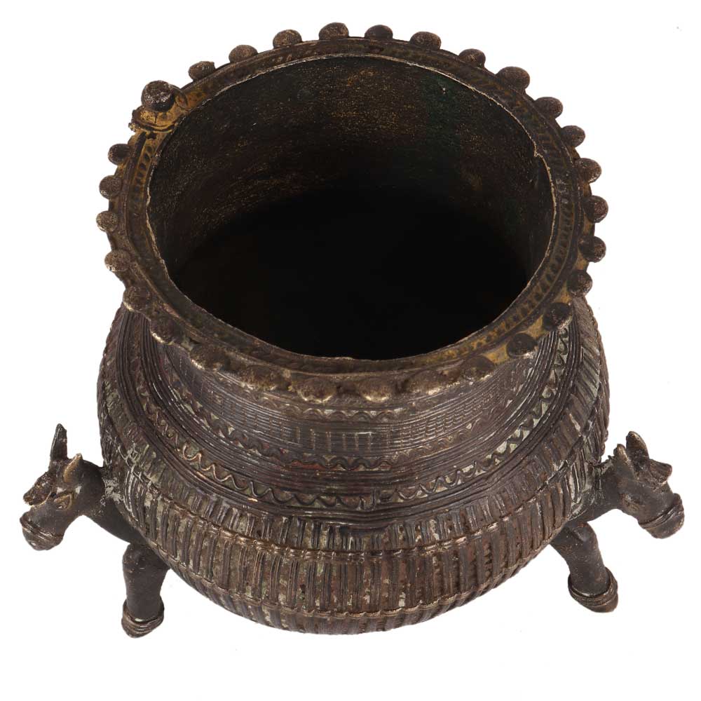 Vintage Tribal Brass pot in black finish always adds a wonderful appeal to our home and serves as a reminder of our rich history!! This hand-selected old brass huge pot is mounted on tri horse legs. T transform this wonderful decor piece into a lovely flower vase for your coffee table or console as a timeless collection