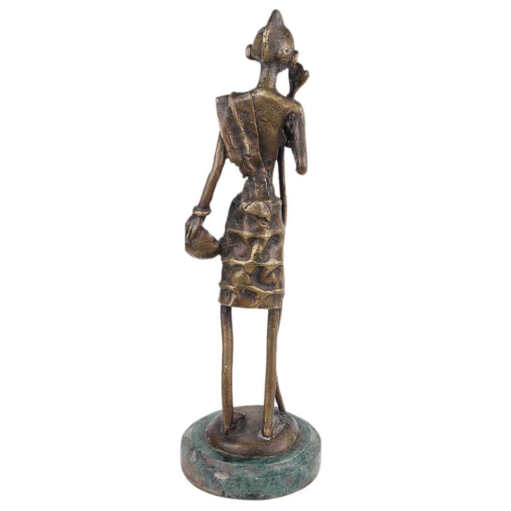 This handmade brass local tribal women standing with a food bowl and a long stick on a round green base . Use it as a centerpiece for home or office used for decorating purpose and can also be given as souvenir. Wedding gift, birthday gift or house warming gift.