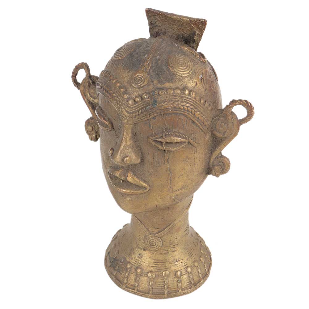 This handmade artifact or brass tribal head showpiece shows the face of a local tribal lady adorned with jewelry and a stylist hairdo. Use it as showpiece, table display ,wedding, anniversary and wedding gift. It can also be used as a corporate gift during diwali and new year.