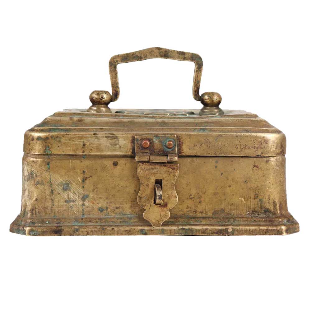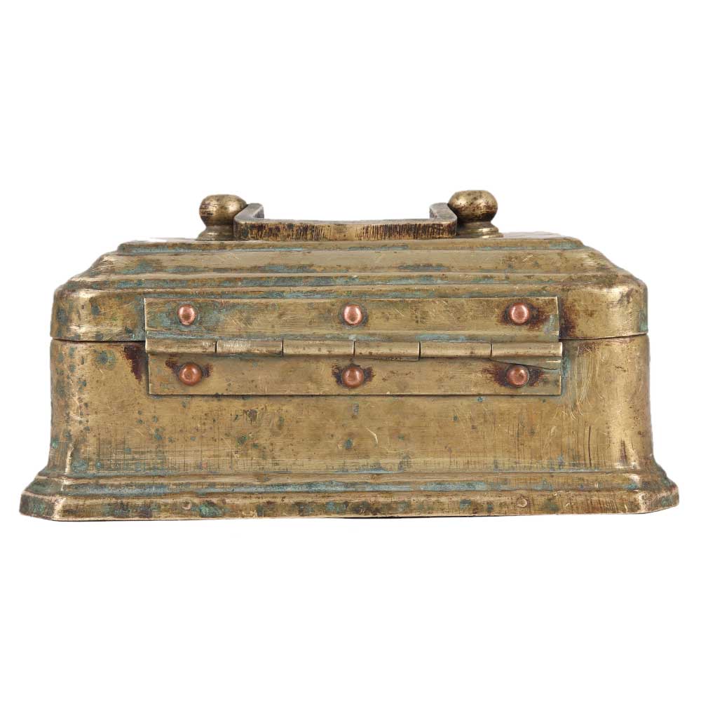 Distinctive handcrafted rectangular brass storage box with a latch and handle for jewellery keeping, tabletop exhibition, presentation of food, and gifting friends and family on Festivals, New Year's, Thanksgiving, or other occasions.