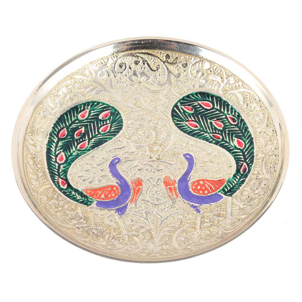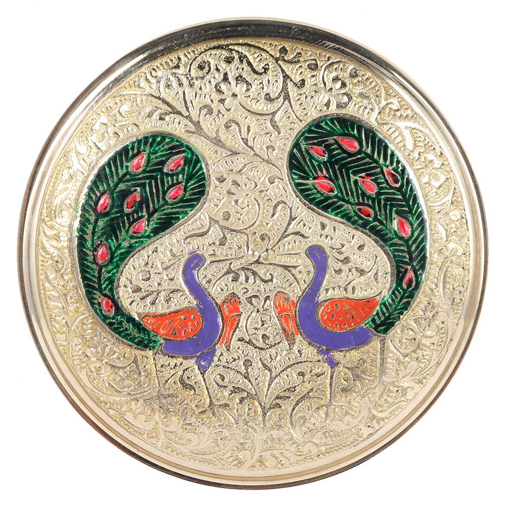 Brass enamel vintage Peacock coaster has lovely etched design of flowers and 2 pretty peacocks in blue with red color on the wings . The center motif is of the peacocks and flowers and the plate has a lovely silver finish. Use it for decoration and gifting.
