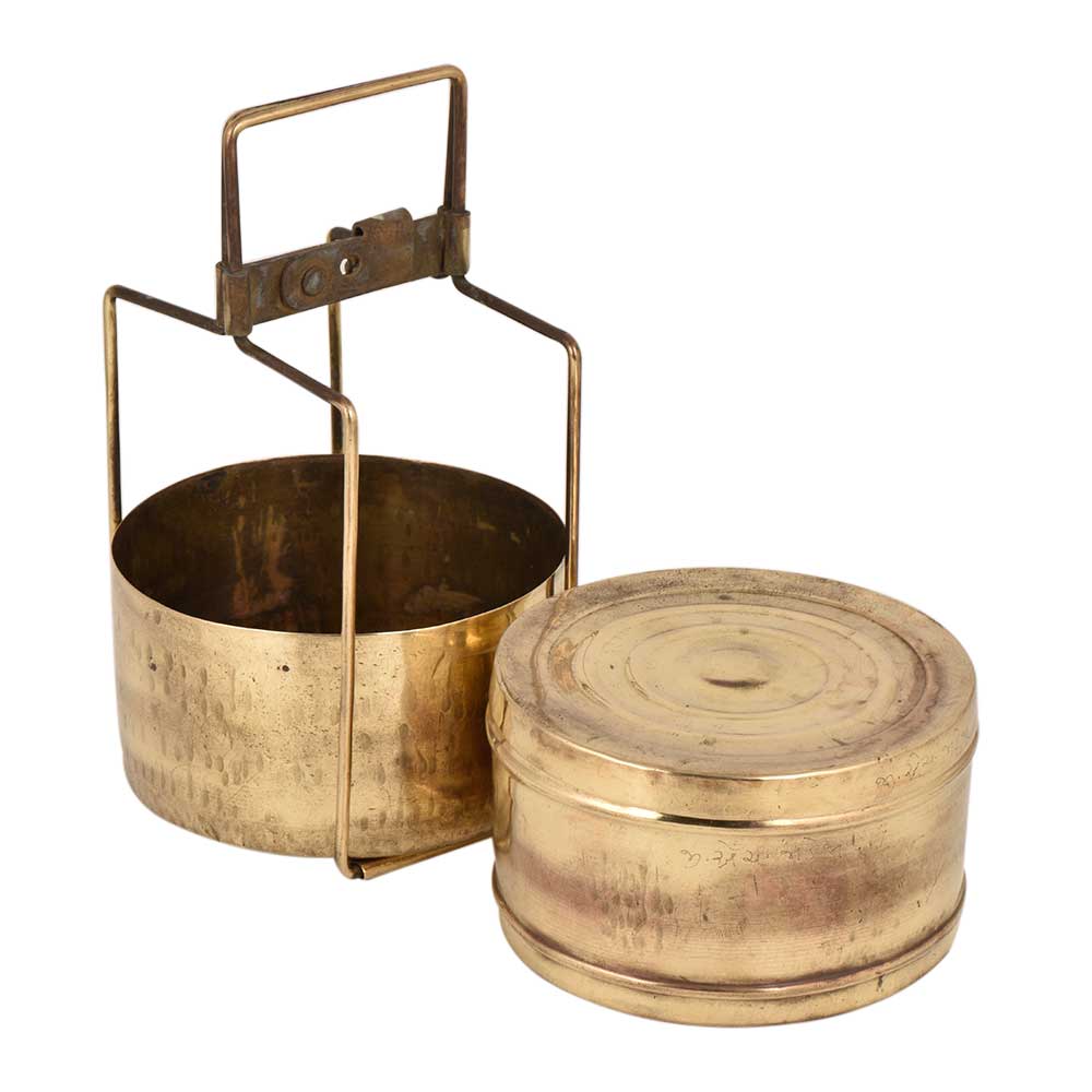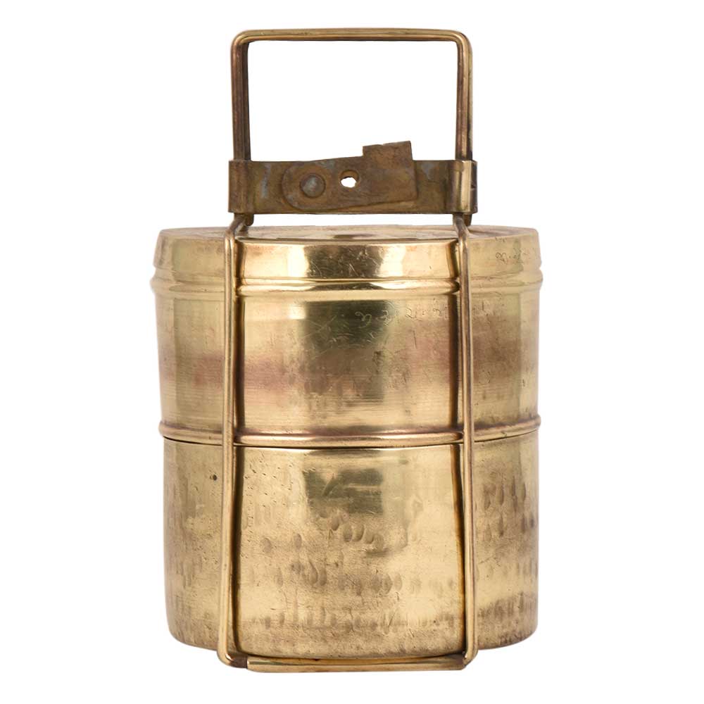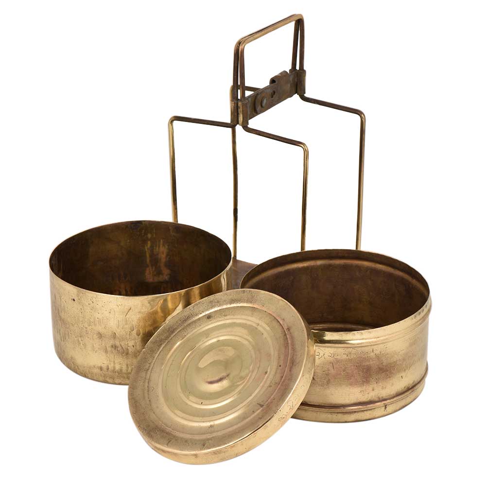 This is a Indian style Tiffin box or storage carrier that was earlier used for transportation of lunch to schools, colleges an offices. It has two Container the top container has the name of the owner engraved on it. It is held together with the help of a brass strap frame. Nice gift on diwali, Christmas , new year, house warming party etc.