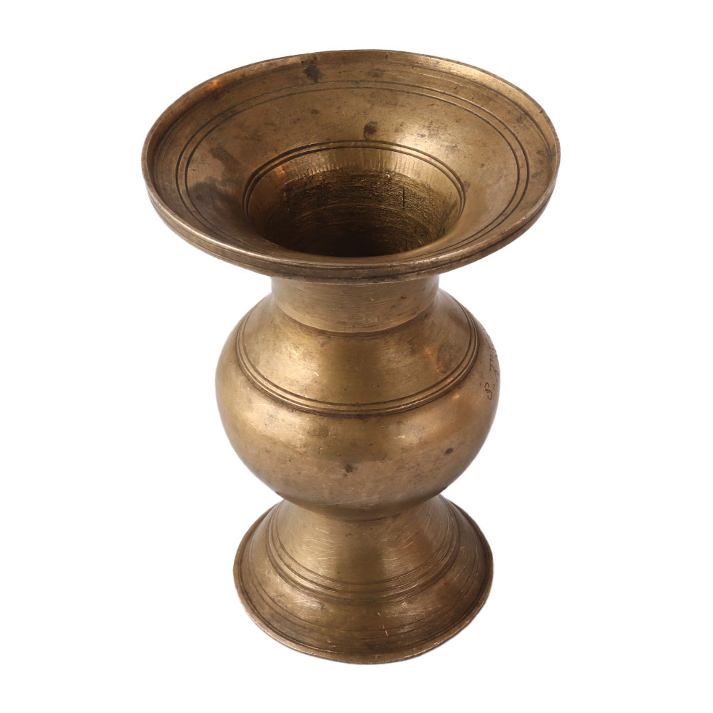 Brass pot or Urn shaped flower vase with a wide mouth and a bulge in the middle and a wide mouth and neck. Can be used indoors or outdoors to beautify vacant spaces, restaurants, hotels, coffee shops, gardens, or as a gift for loved ones. This beautiful antique Bell Metal Vessel from Kerala is a sought-after collectible. It is a priceless addition to your collections of vintage items. With this attractive brass flowerpot or vase, you can add the charm of antique finds to your home. This lovely brass flower pot looks lovely in your dining room, bedroom, center table, living room, or any other location of your choice. It is suitable for artificial flowers.