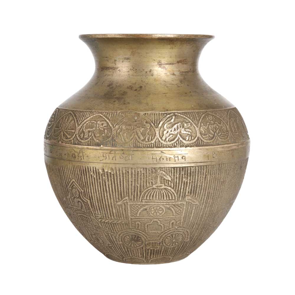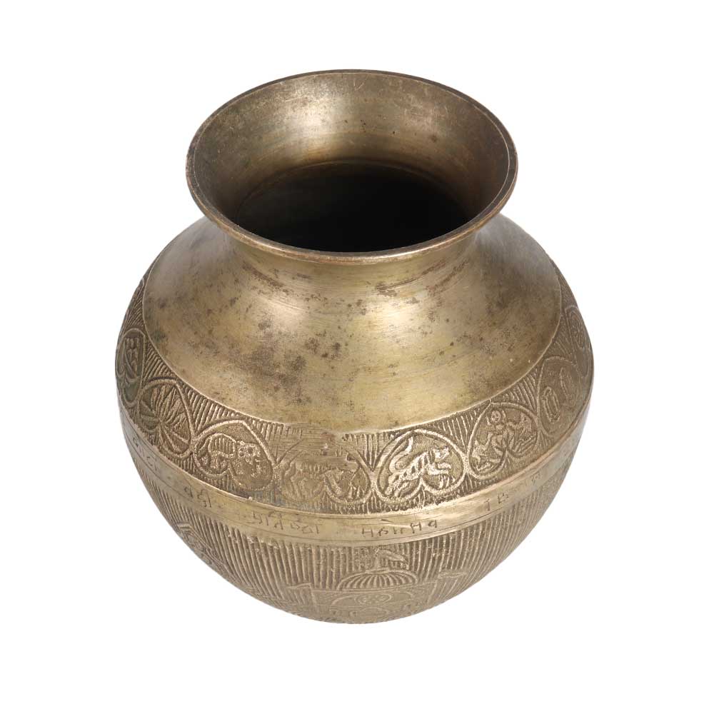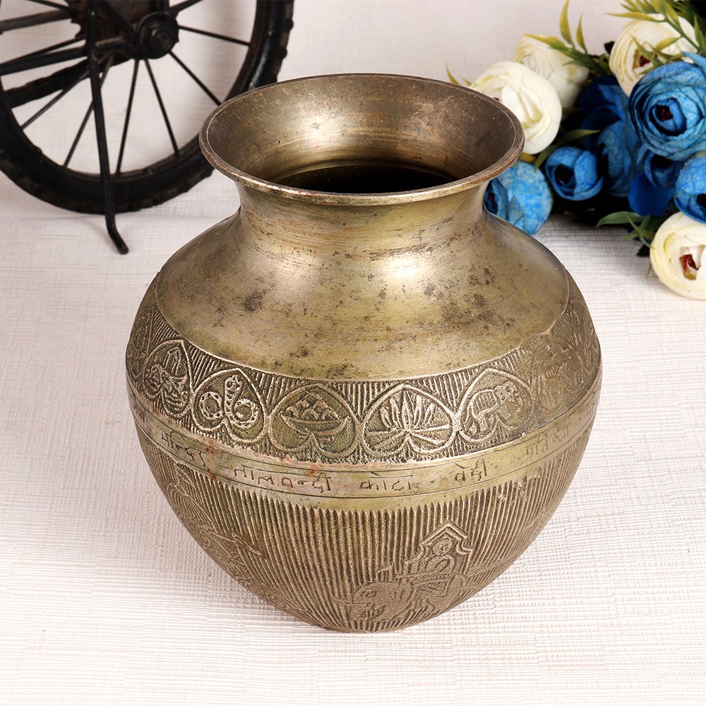 A used brass water pot used in Indian households to store sacred water from the river Ganga. This exquisite piece has engravings that make it an exceptional decorative piece. It has a flat bottom with elegant brown finish that leaves a long-lasting impression in the decoration. Add an aesthetic touch to your interior decoration with a beautiful water pot. Place it on the table, shelf, reception desk, bill counter or altar to attract your customers. This brass lota will reflect your rich heritage when placed in your home. It is handcrafted and made of high quality brass by skilled Indian artisans. A gift for your family, friends or relatives on special and festive occasions.
