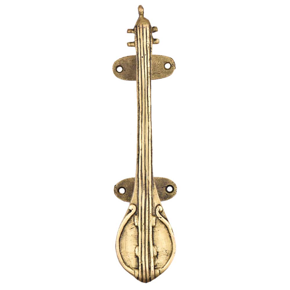 Indianshelf.com for bulk/wholesale orders.Indianshelf.us for personal purchases.Introducing the Brass Veena Door Handle Musical Instrument Door Handle, a stunning blend of artistry and functionality. This elegant door handle is crafted in the shape of a veena, a traditional Indian musical instrument that represents the rhythm and harmony of life. Made of high-quality brass, it adds a timeless charm and spiritual essence to any door. Whether you're looking to elevate your home decor or simply appreciate fine craftsmanship, this door handle is sure to make a lasting impression.