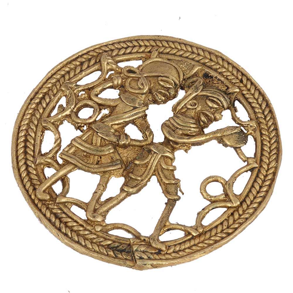 Brass Wall Art Tribal Couple Daily Activity In Round Frame using the idea of daily activities here it depicts a dancing couple . You can frame it and mount it on a wall , Corridor ,Place it on your study table. Diwali gift, anniversary gift, house warming gift , souvenir and showpiece.