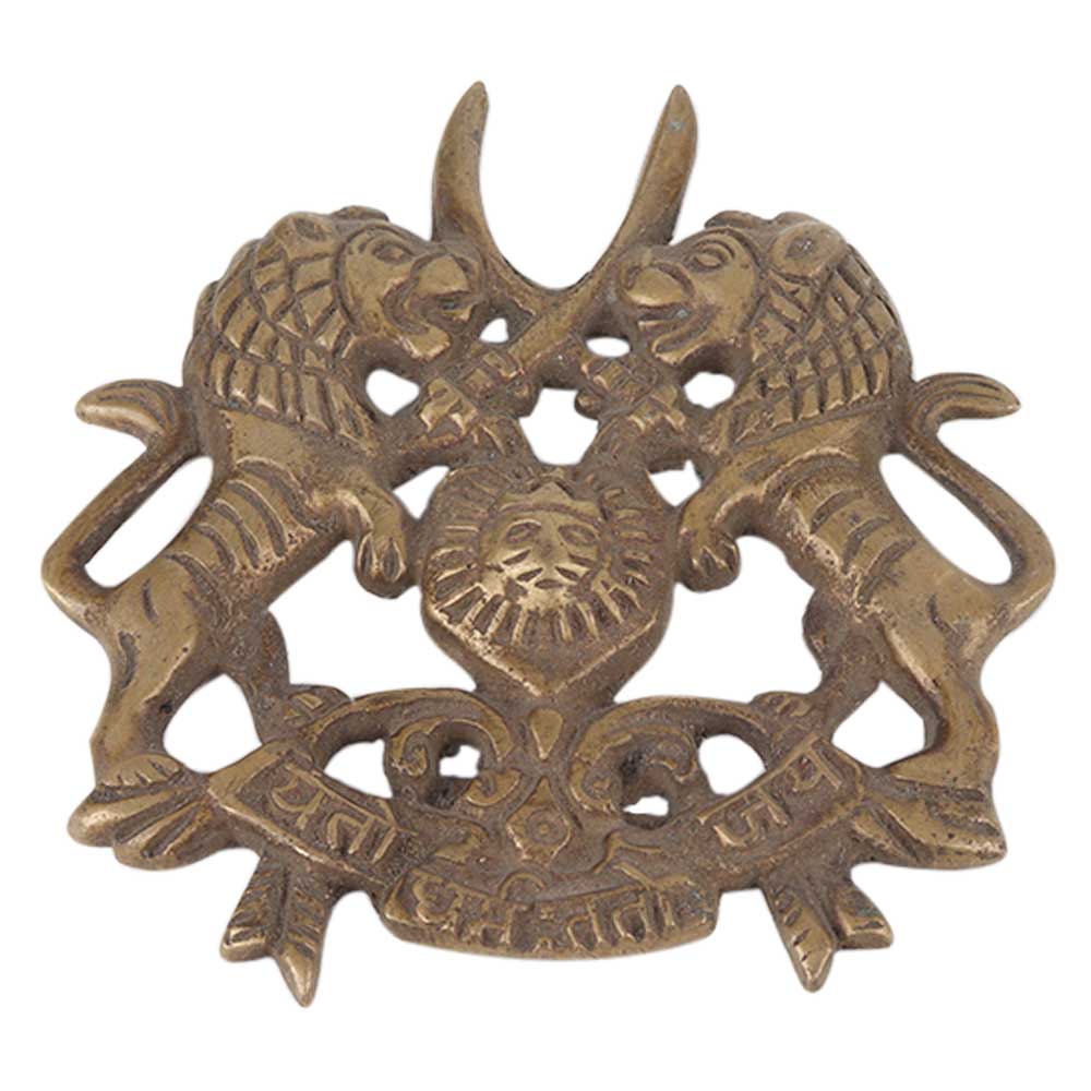 • Brass Wall Hanging with Carved Two Lion Hunting Raj put Logo Design