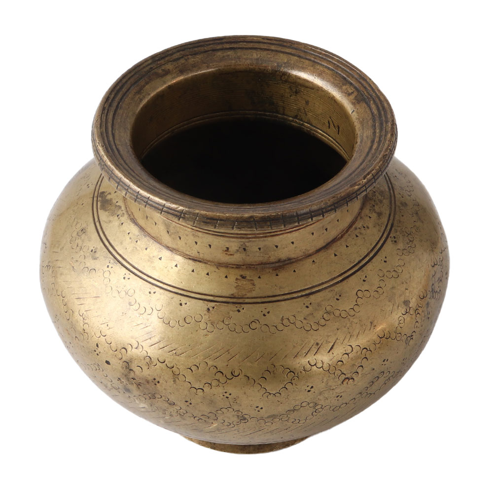 This old brass lota, or water pot, is traditionally carved and made in accordance with Indian culture. It is not only used for worship but also as a component of the decor in our kitchen. Excellent as a wedding or Diwali gift.