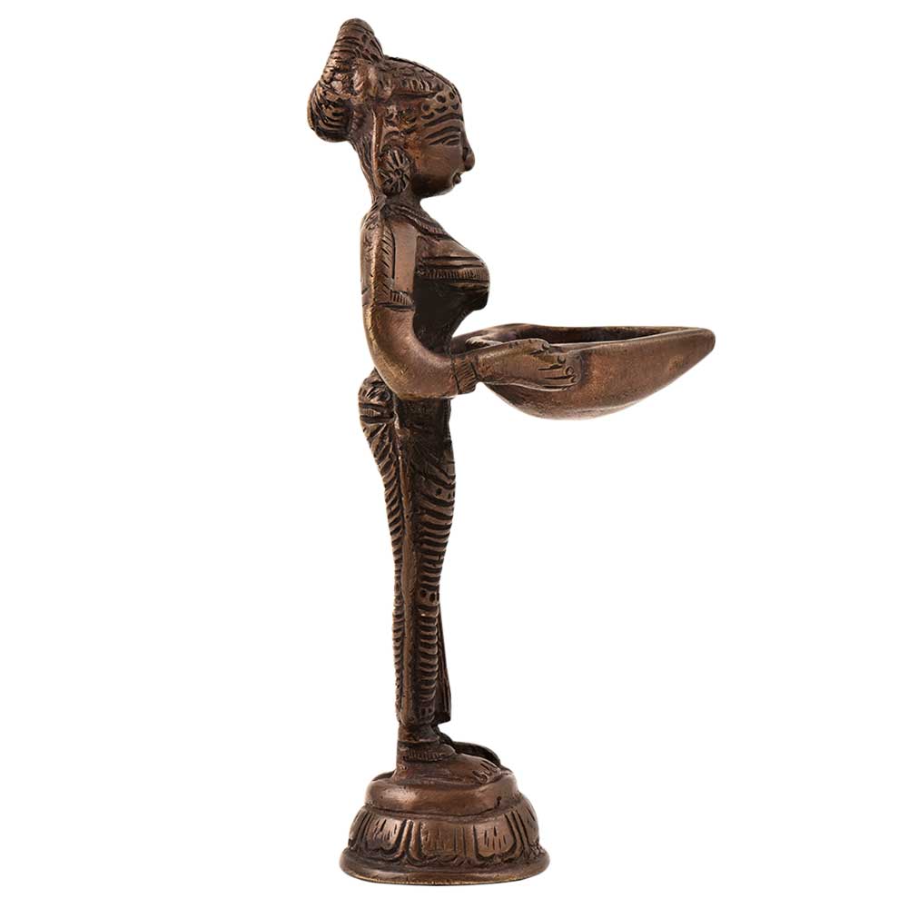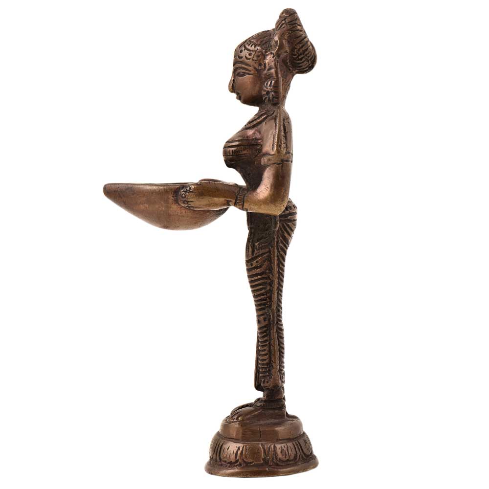 Made of Solid brass the image shows an Indian lady holding a lamp in her hands dressed in traditional attire used as décor for home, office, and as an oil lamp used for performing puja and aarti. An ideal gifting option.