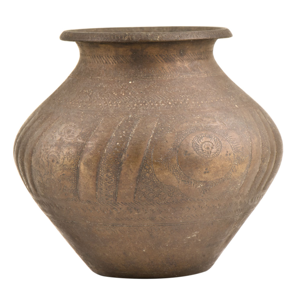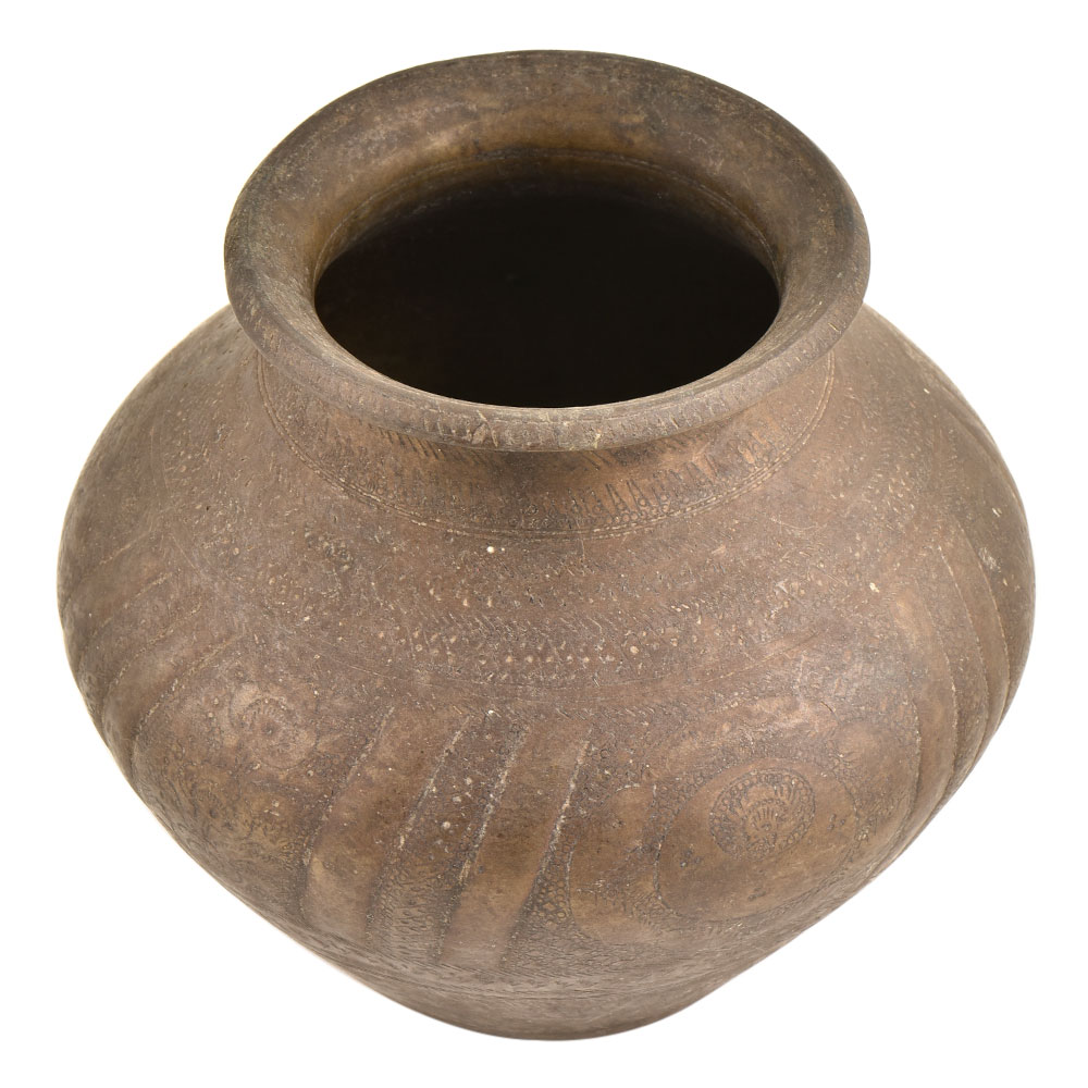 The intricately interwoven bands, ridges, and dimples mark this as a vessel of the tribal groups. The textural combinations and robust make it look very decorative and rustic. This Handmade Indian tribal water vessel is a particularly fine example of Indian tribal craftsmen.