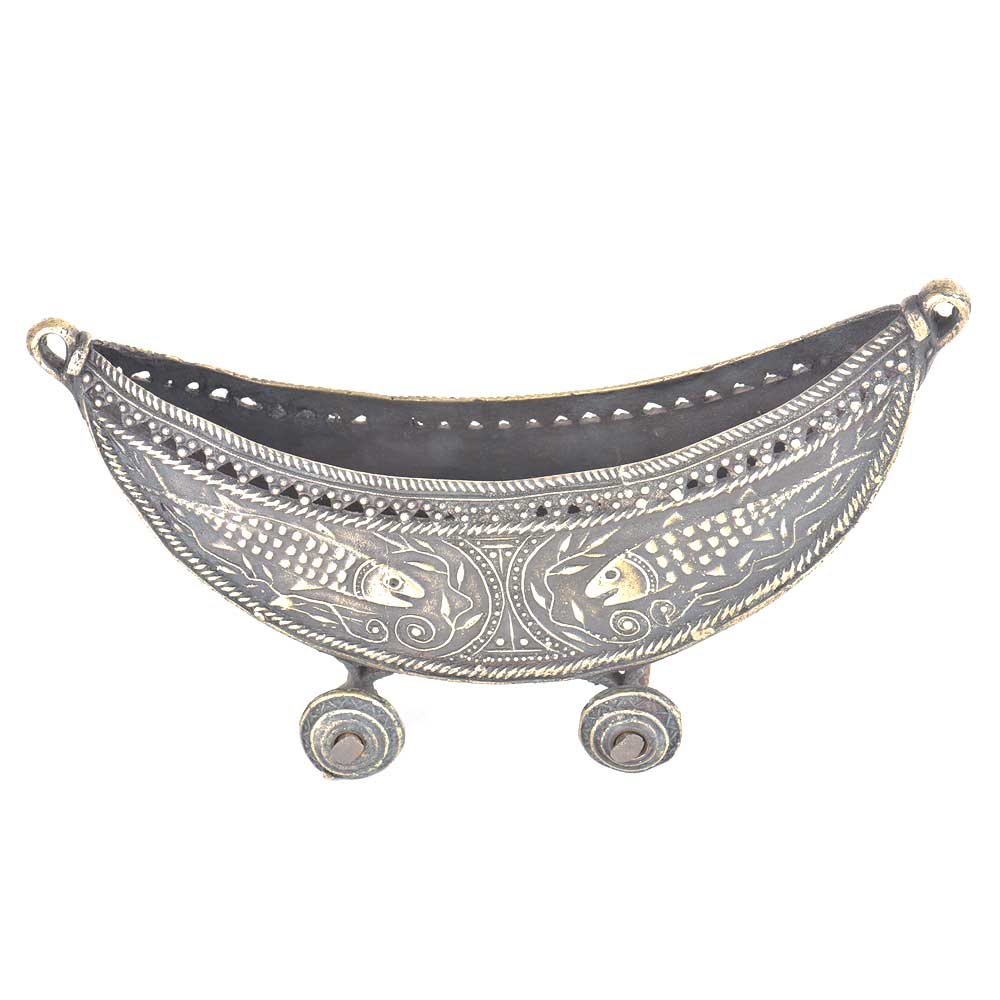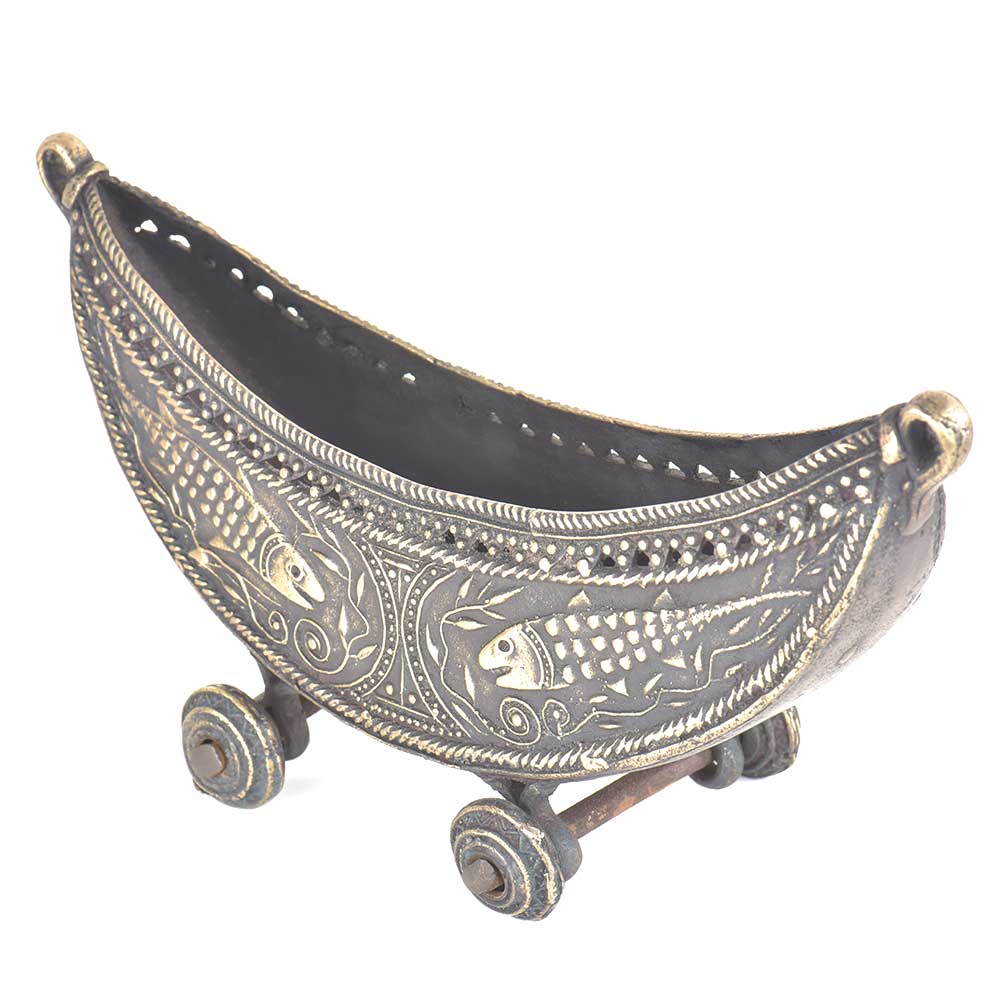 Boat with wheels which makes it mobile and fish engraved on it made beautifully. This boat is made of bronze and is handmade by the skilled craftsmen of India. It has fine engravings done very beautifully and it can be used for decoration, gifting etc.