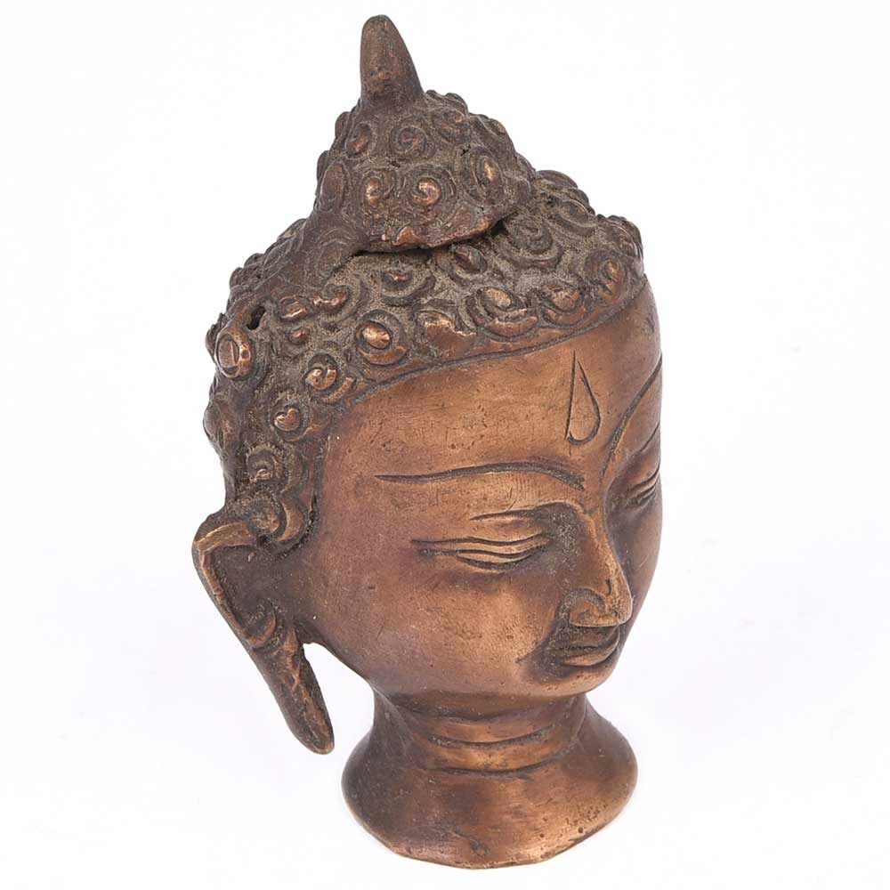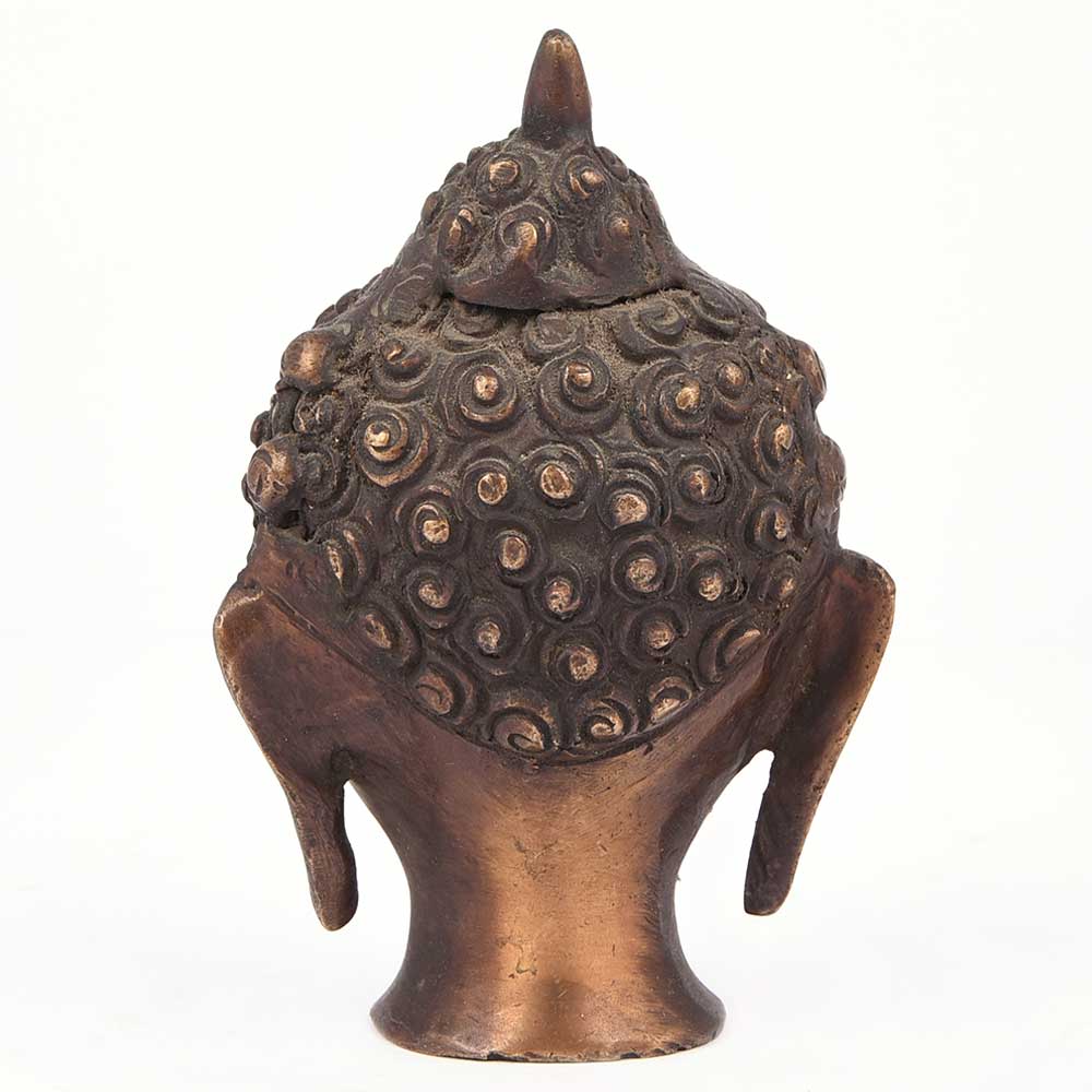 This Small Buddha Head has a Peaceful Expression with His Eyes Downcast in Quiet Contemplation. His Earlobes are Stretched From Him Wearing Heavy Gold Earrings in His Princely Youth. His Hair is Arranged in Tight, Sea Shell Shaped Curls. The Buddha Head Would Be Perfect for Any Home Altar or Shrine.