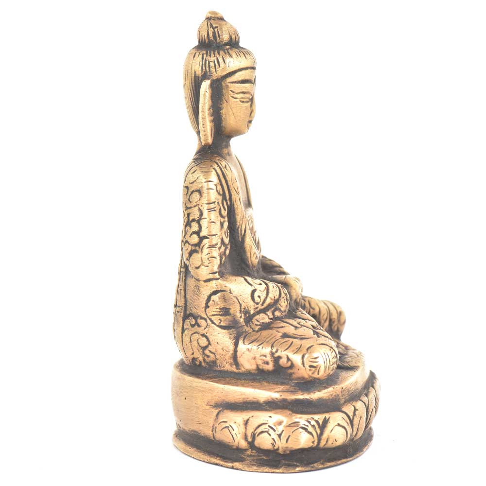 Buddha is sitting on a raised platform with eyes closed and hands in meditational position, this figurine is made of bronze and is handmade by the skilled craftsmen of India. This can be used for gifting, decoration, worshipping etc.