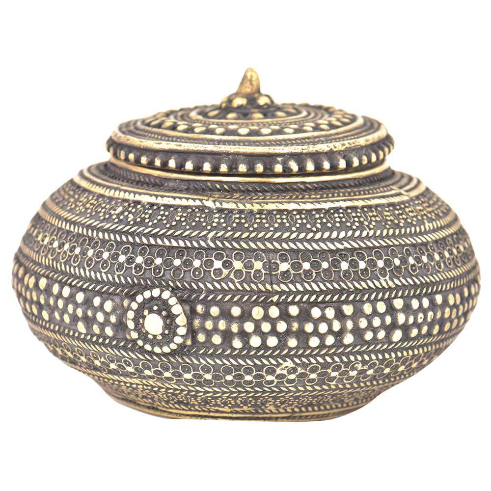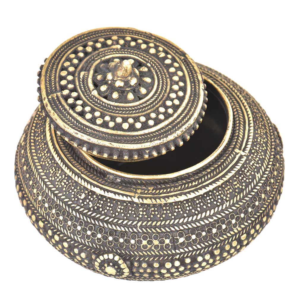 Jewellery box with lid and fine engravings which makes this box more attracting and beautiful. This beautiful jewellery box is circular in shape and is made of bronze and is handmade by the skilled craftsmen of India. It can be used for gifting and decoration etc..