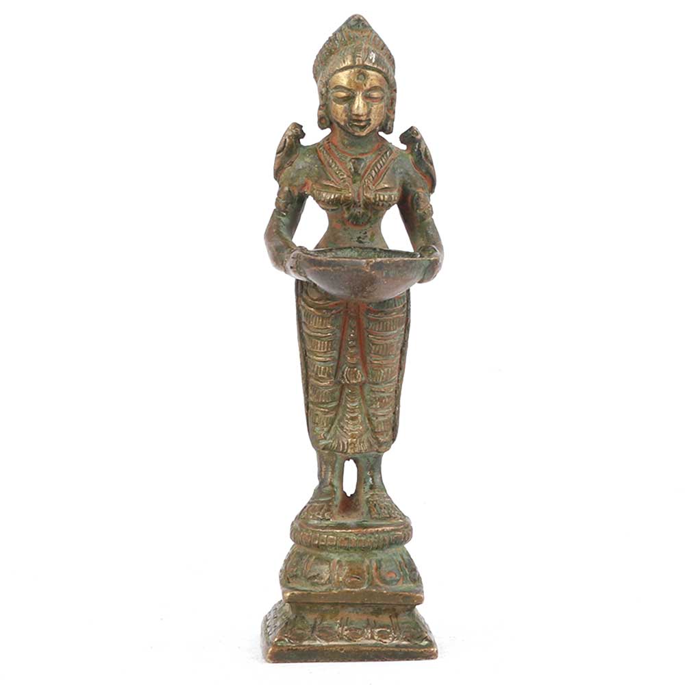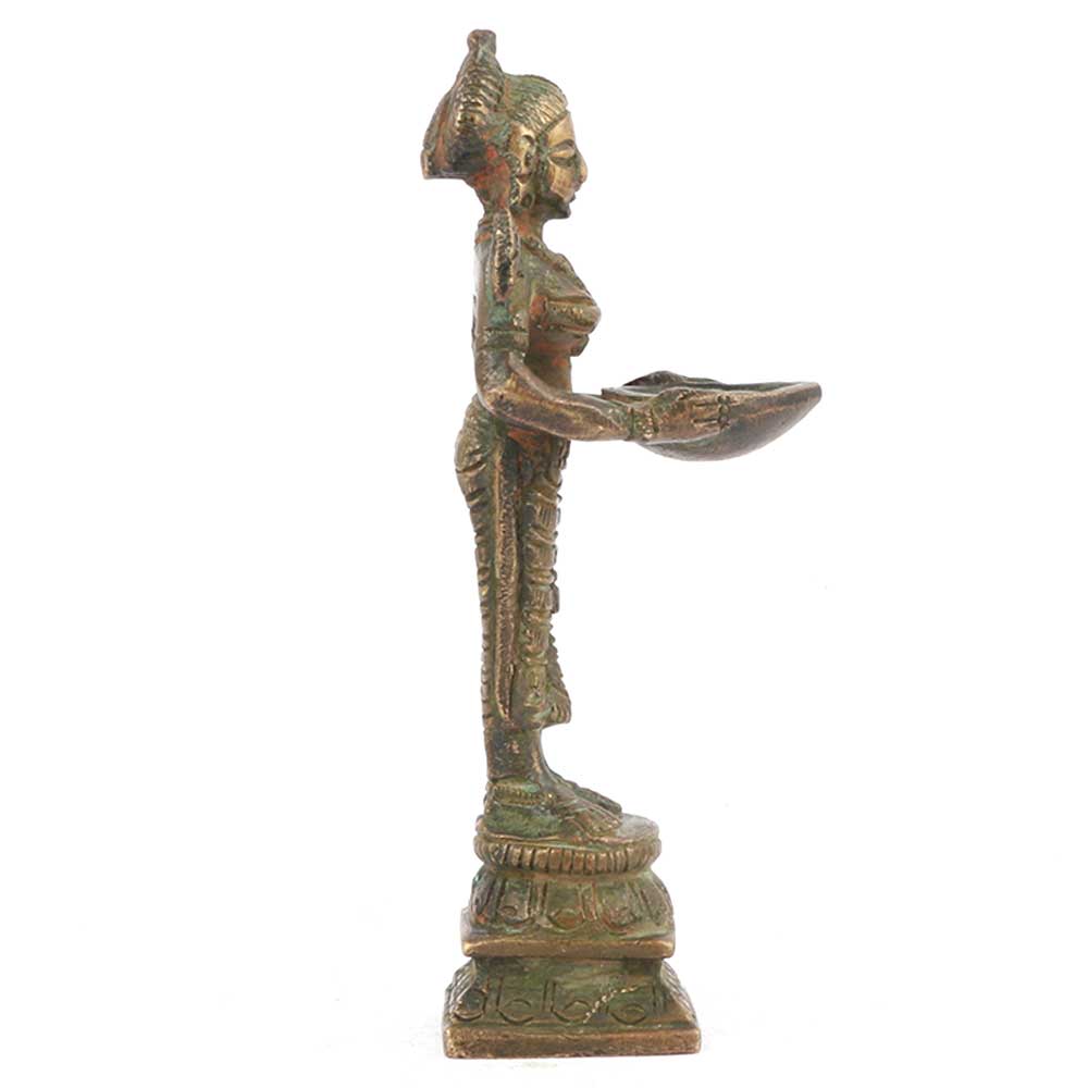 Bronze Lady Holding a Diya is Made by the Skilled Craftsmen of India. The Lady is Standing on Raised Platform Holding a Diya in Her Hands and It has Beautifully Done Fine Engravings.