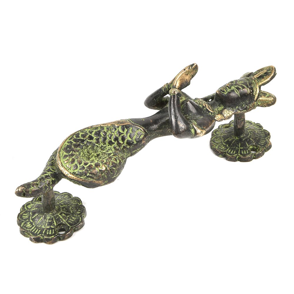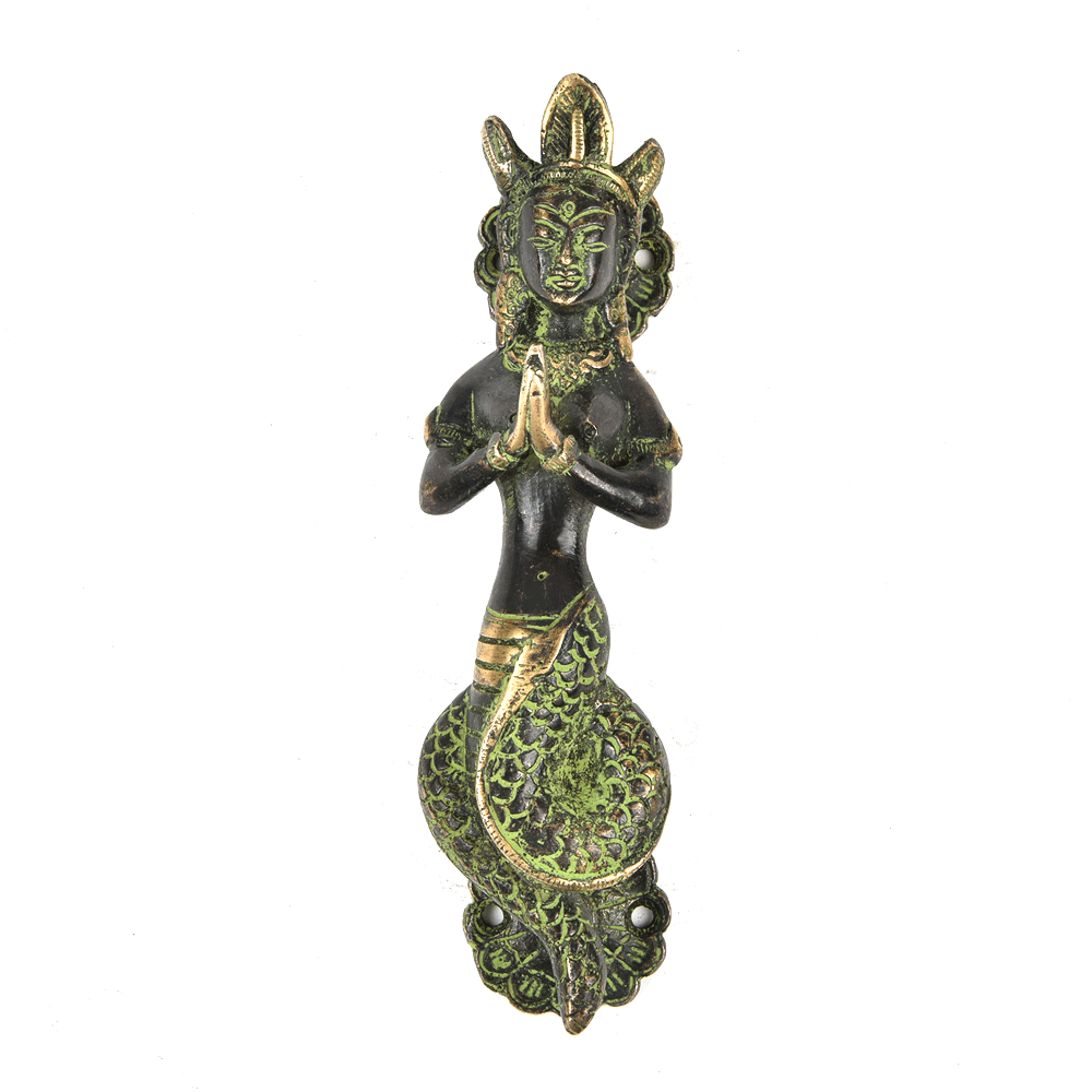 Indianshelf.com for bulk/wholesale orders.Indianshelf.us for personal purchases.Transform your space with the Brass Naga Kanya Art Door Handle, a remarkable fusion of artistry and traditional design. Drawing inspiration from ancient mythology, this door handle features the captivating image of the Naga Kanya – a legendary serpentine goddess. Crafted from robust Brass, this handle infuses your doors with an aura of mystique and sophistication, merging historical significance with contemporary practicality.