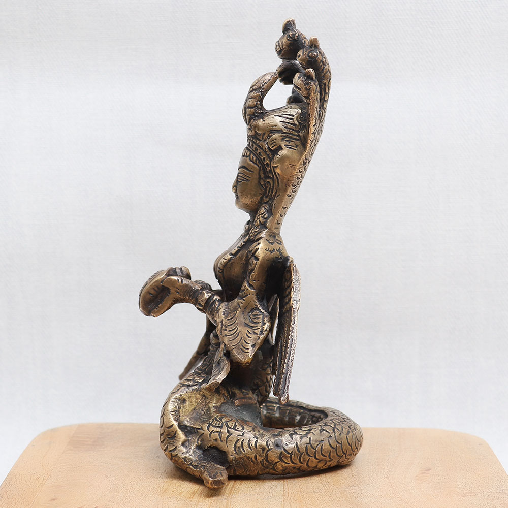 Buy a bronze Goddess Naga Kanya murti online that is expertly crafted by skilled Indian artisans with a passion for perfection. This magnificent murti captures the divine essence of Naga Kanya, the revered deity known for her association with serpents, in a stunning representation made from high-quality bronze. The statue showcases intricate details that bring the goddess to life, while the antique finish adds a touch of timeless beauty. Whether you choose to place this enchanting statue in your home, office, restaurant, or hotel temple for worship or include it as a cherished piece in your vintage collection, its presence will elevate any space. Additionally, this captivating artwork is perfect for museums or exhibitions, where its rich cultural significance can be appreciated by all. With its impeccable craftsmanship and intricate design, this statue can also be used as a striking decorative item. Furthermore, this Naga Kanya statue serves as an auspicious and thoughtful gift for your loved ones during special occasions or festive celebrations. Explore the world of Indian god statues and god idols for home with this timeless treasure.