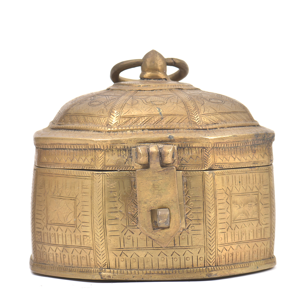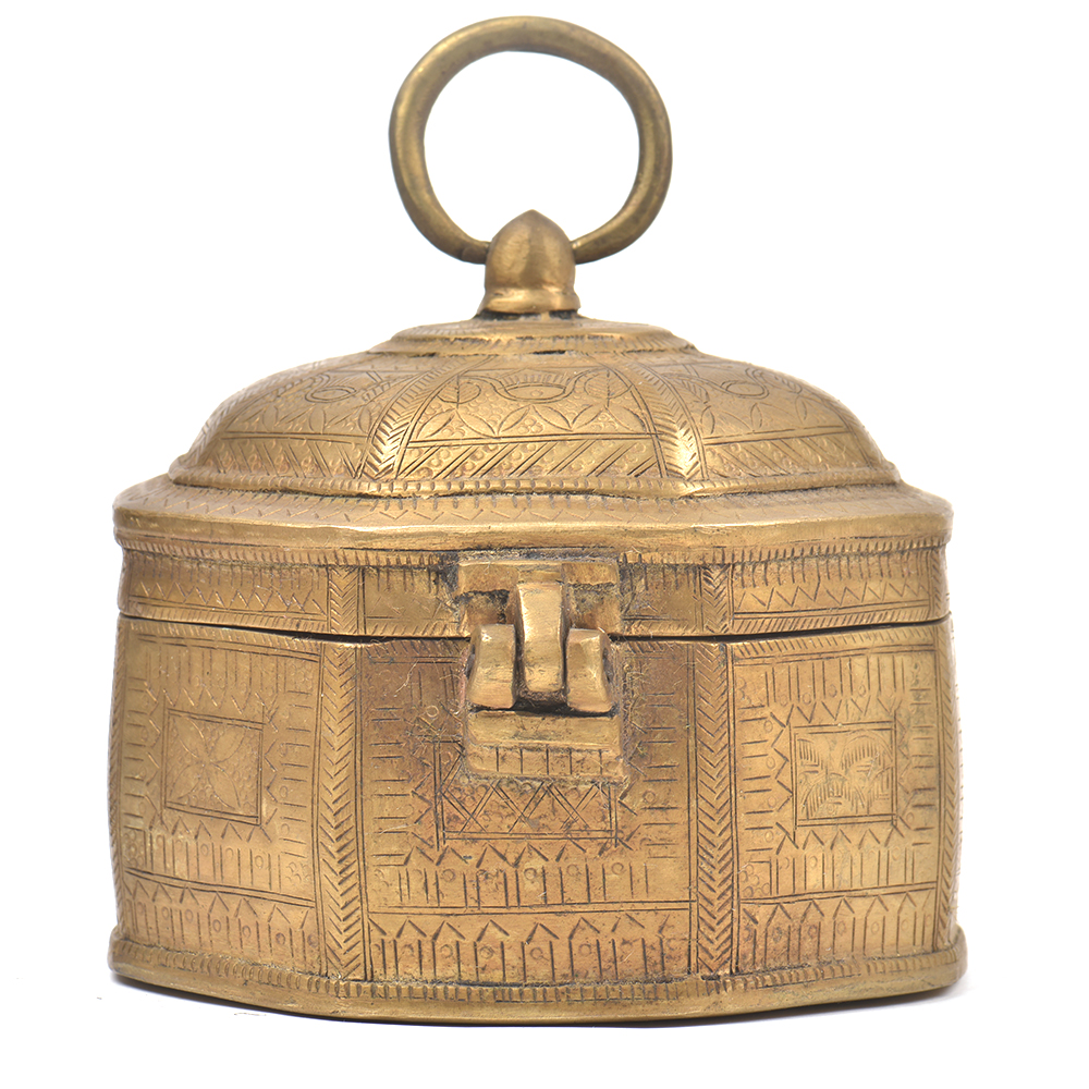 This Octagonal Shaped Storage Box is Made of Bronze and It is Handmade by the Skilled Craftsmen of India. This Storage Box is Beautifully Etched and It has a Hook to Carry Easily and a Lock System Too Keep Your Things Safely. �