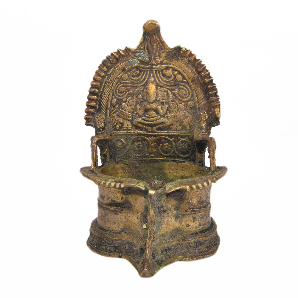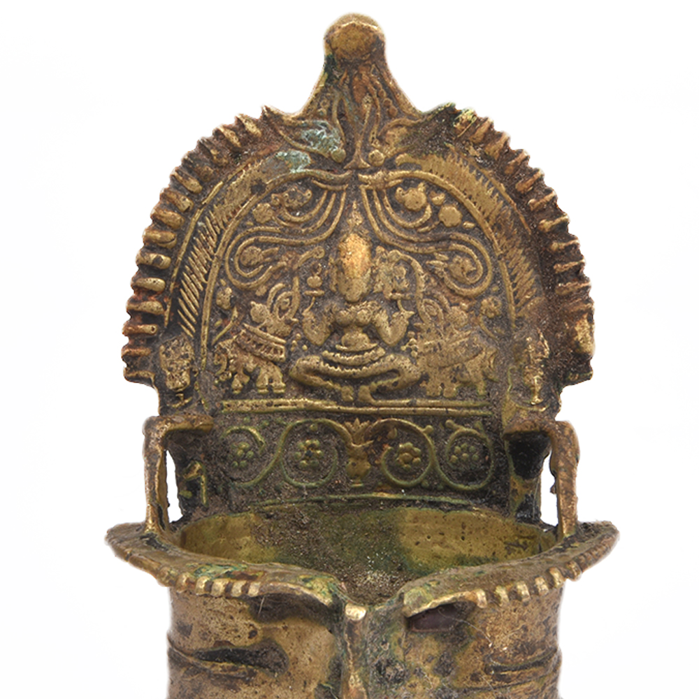 Old Bronze Oil Lamp of Goddess Laxmi Seated in the Center Flanked by Two Elephants Bathing Her. It is Made by Lost Wax Process. Adds Spiritual Flavor to Your Decor. Vegetable Oil, Mustard Oil or Desi Ghee can be Use to Light the Lamp with Cotton Wicks.