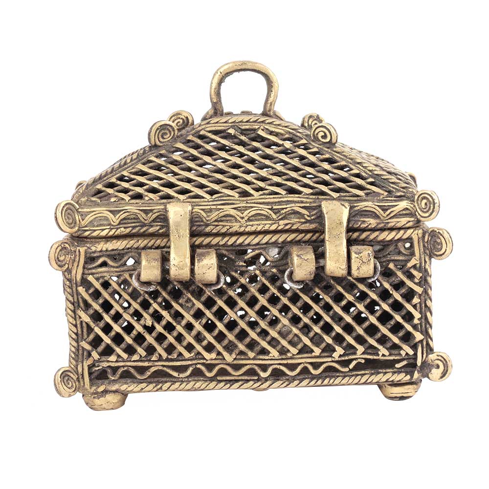 The dhokra art jewellery box is made of bronze and is handmade by the skilled craftsmen of India. This jewellery dhokra art is beautifully made for storing, gifting decoration etc. It has very pretty engravings which makes it more attracting and has a lock system to ensure safety.