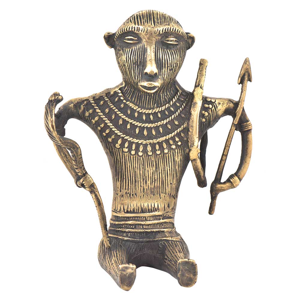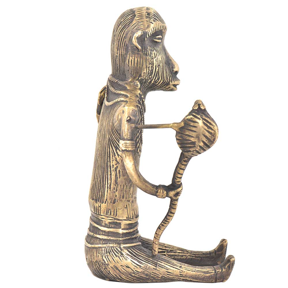 Tribal art huntsman sitting holding a snake in his hand is and carrying bow & arrow on his shoulder. This beautiful bronze statement piece is handmade by the local craftsmen of India. It can be used for gifting and home decoration.