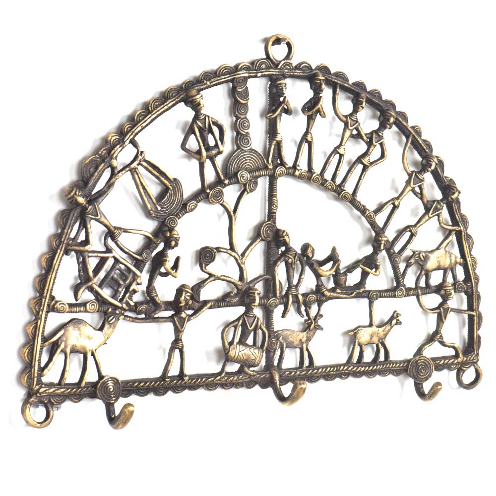 Tribal art wall hook with 3 hooks, semi-circular shape with tribal people doing the activities of daily basis. This wall hook is made of bronze and is handmade by the skilled craftsmen of India. This wall hook will look beautiful when hanged on your beautiful wall.