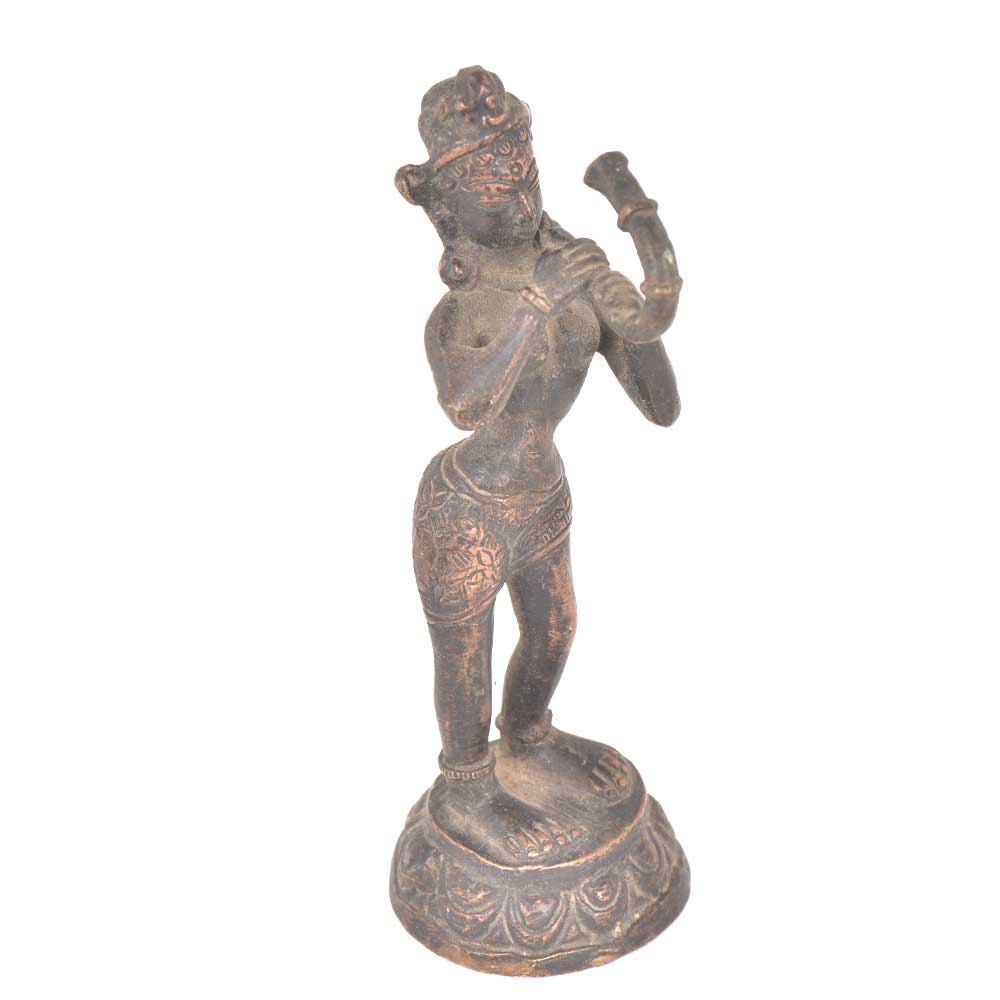 Tribal lady playing tribal trumpet is handmade by the local craftsmen of India and is made of bronze. This bronze figurine can be used for gifting, decoration etc. Beautifully engraved and a fabulous centre table piece.