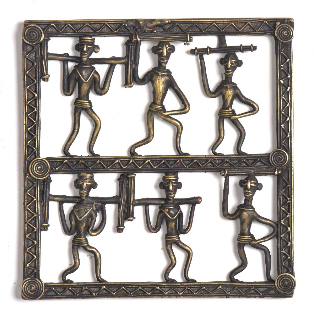 Tribal art wall hanging 6 men holding wood in different ways. This beautiful wall art hanging is made of bronze and is handmade by the skilled craftsmen of India. It can be used for gifting, home decoration etc.