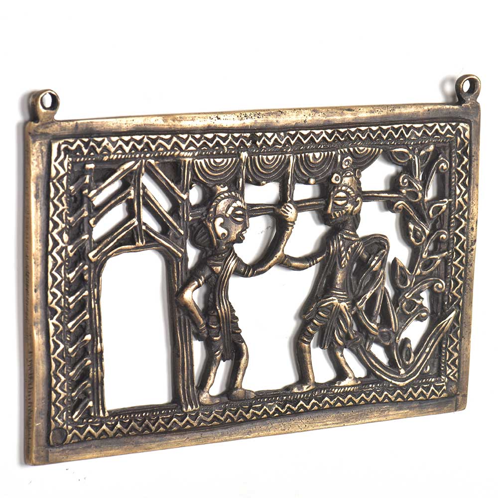 Wall art hanging with a woman and man, man holding woman's hand in one hand and holding an axe in the other hand. This wall hanging is made of bronze and is handmade by the local craftsmen of India.