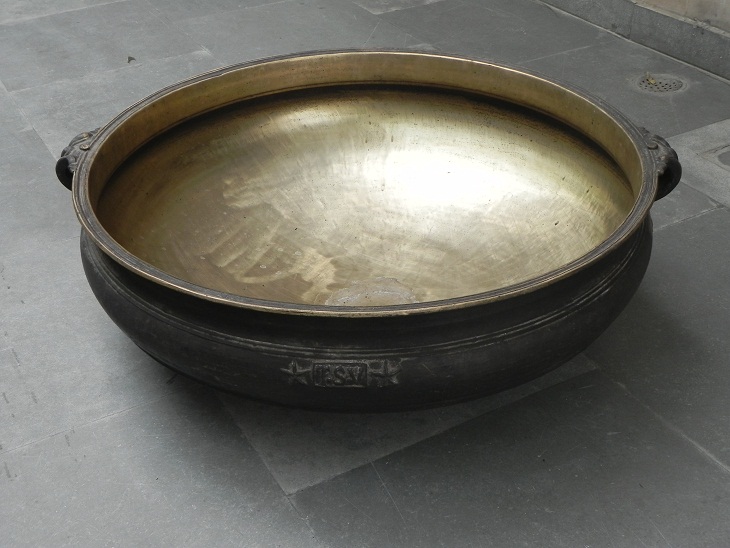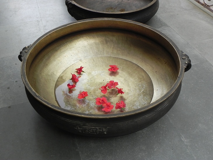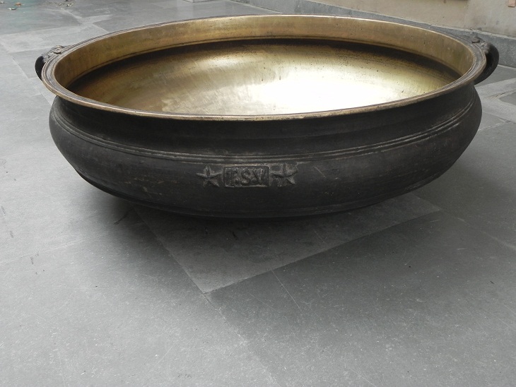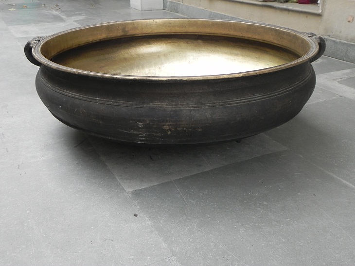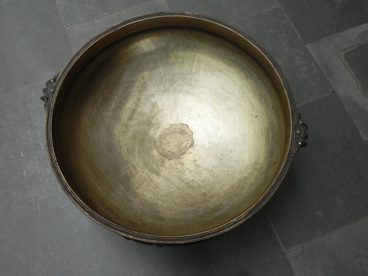 South Indian bronze urli. Made by lost wax process. One of its kind. It was used before to cook food to serve gods and deities. Now it is ideal to put flowers and floating candles and use it as a perfect indoor/outdoor decoration. The beauty of this piece lies in the way of making this piece. This urli is made by lost wax process. Which is completly done by hand. It serves as a beautiful bronze bird bath too.