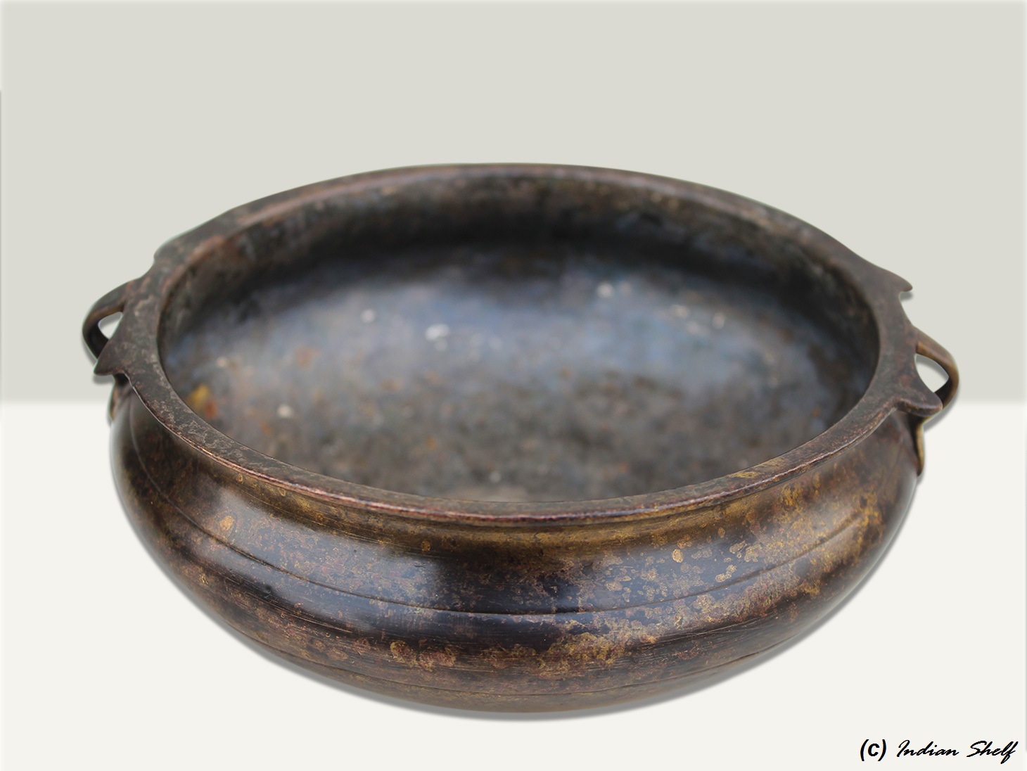 South Indian bronze urli Made by lost wax process. One of its kind. It was used before in India to cook food to serve gods and deities. Now it is ideal to put flowers and floating candles and use it as a perfect indoor decoration. The beauty of this piece lies in the way of making this piece. This urli is made by lost wax process. Which is completly done by hand. It serves as a beautiful bronze bird bath too.