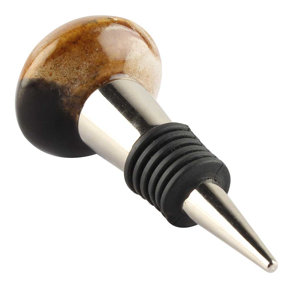 Brown And Black Ceramic Wine Stopper Online. Zinc Alloy Wine Bottle Stopper with Attractive Jute Bag Packaging.