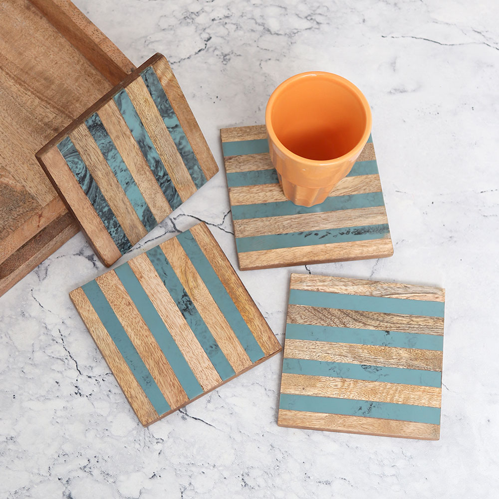 A Beautiful Wooden Tea Coaster Set that is crafted from premium-quality wood and designed to add a touch of elegance to any space. This set includes four square-shaped coasters, meticulously handmade by highly skilled Indian artisans. With its captivating brown and blue-coloured pattern in an antique finish, each coaster becomes a decorative piece that effortlessly blends with any interior decor. They serve as a reliable shield, protecting your surfaces from stains caused by water, tea, juice, or coffee glasses. Whether it\'s at home, the office, a restaurant, hotel, or a cosy cafe, these wooden coasters provide a practical solution to keep your tables and desks spotless. In addition to their practicality, these coasters make an ideal gift for your loved fours on special or festive occasions. Offering a harmonious combination of utility and aesthetics, the Wooden Tea Coaster Set is the epitome of the best wooden coaster available, showcasing the skill and artistry of Indian craftsmanship.
