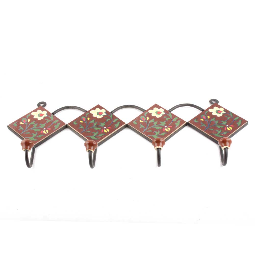 Brown And White Flower Ceramic Tiles Hooks. When Put on Wall or Cabinet It is An Art in Itself. The Metal Part of this Hook is Black Powder Coated.