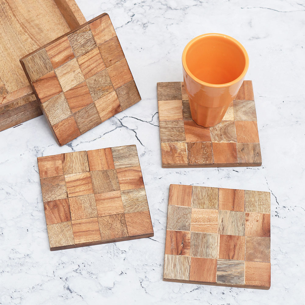 Indianshelf.com for bulk/wholesale orders.Indianshelf.us for personal purchases.These Brown Check Pattern Wooden Coasters are the perfect blend of functionality and style. Made from high-quality wood, this set of four coasters is designed to protect your surfaces from spills, stains, and heat, while adding a cozy, rustic charm to your space. The brown checkered design gives them a timeless look that complements both modern and traditional décor, making them an ideal addition to your kitchen, dining room, or living room.