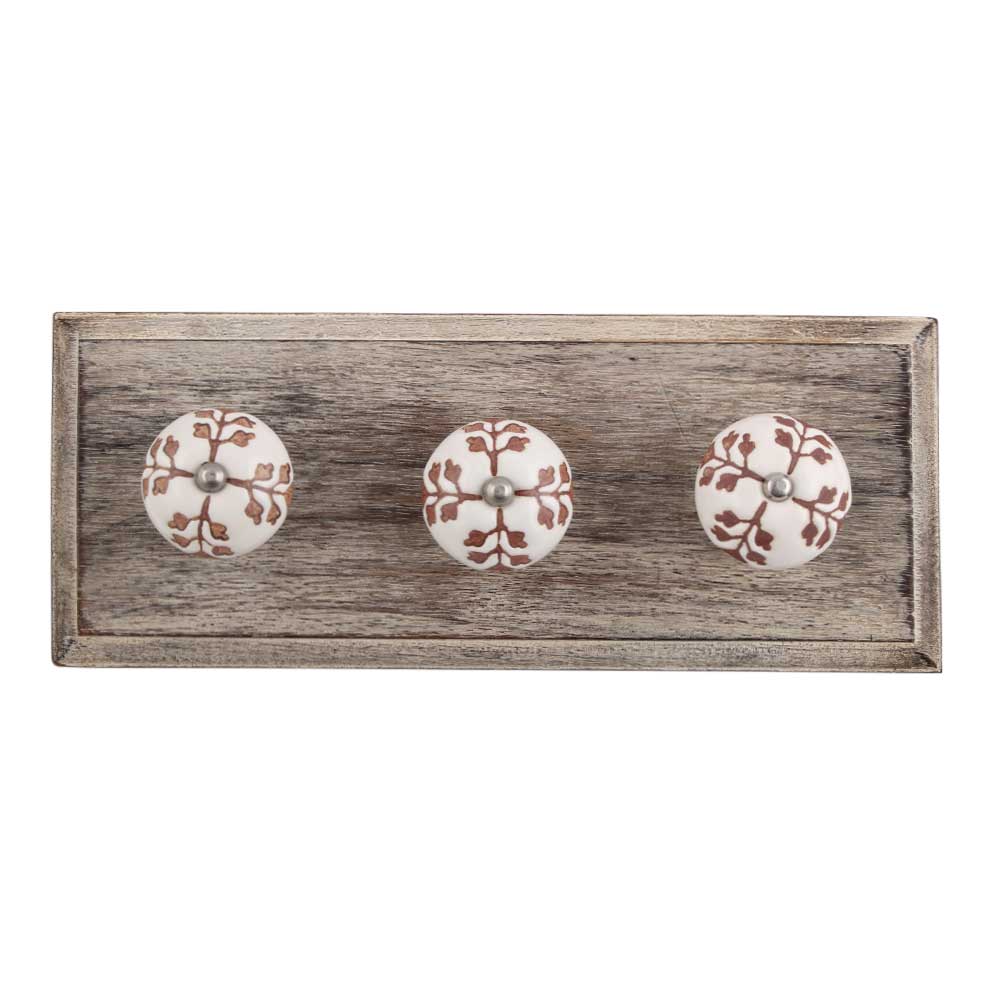 Brown Leaf Cut Flower Etched Ceramic Wooden Hook. A Perfect Complement to the Soft Tone of the Wood are these White Traditional Hat & Coat Hook Made of Genuine Porcelain and Brass. It can be use to Hang Jewellery, Leashes, Towels, Scarves, Light Weight Sweaters, Caps Etc.