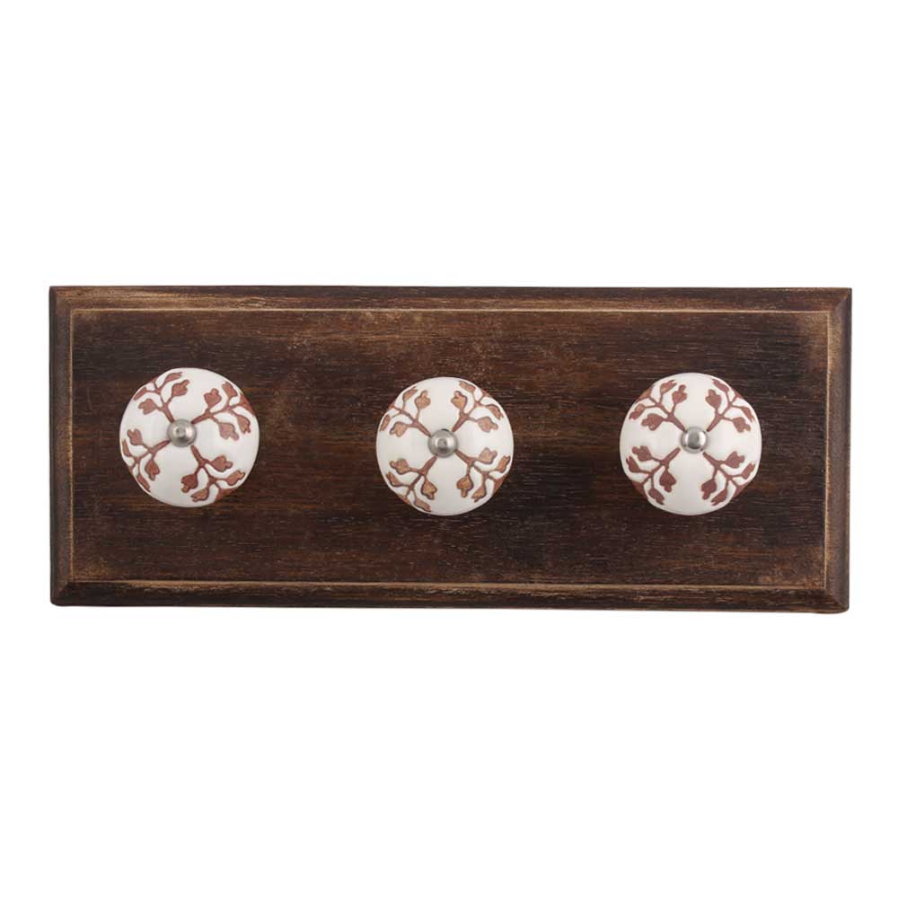 Brown Leaf Cut Flower Etched Ceramic Wooden Hook. A Perfect Complement to the Soft Tone of the Wood are these White Traditional Hat & Coat Hook Made of Genuine Porcelain and Brass. It can be use to Hang Jewellery, Leashes, Towels, Scarves, Light Weight Sweaters, Caps Etc.