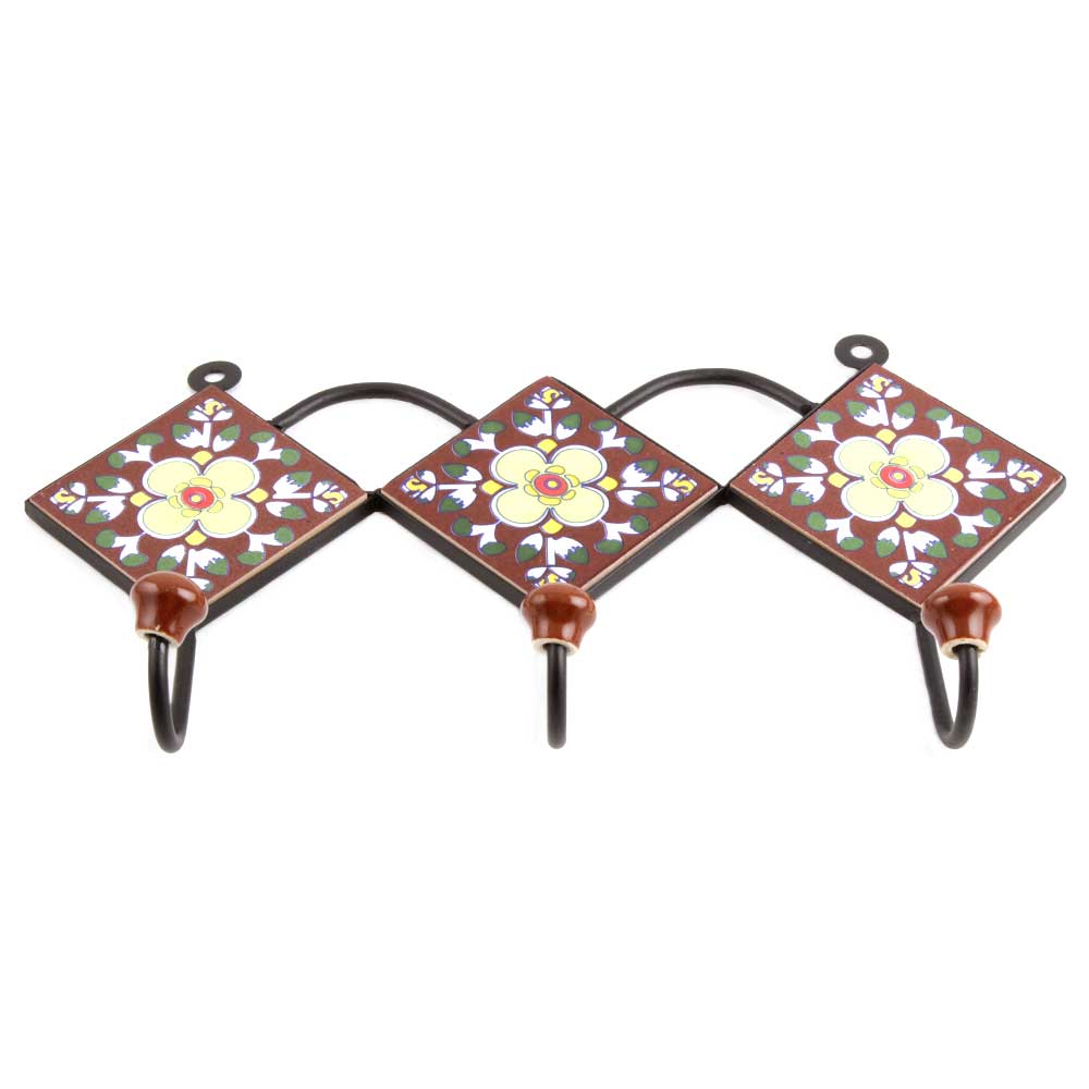 Brown Light Yellow Floral Tiles Hook. When Put on Wall or Cabinet It is An Art in Itself. the Metal Part of This Hook is Black Powder Coated.