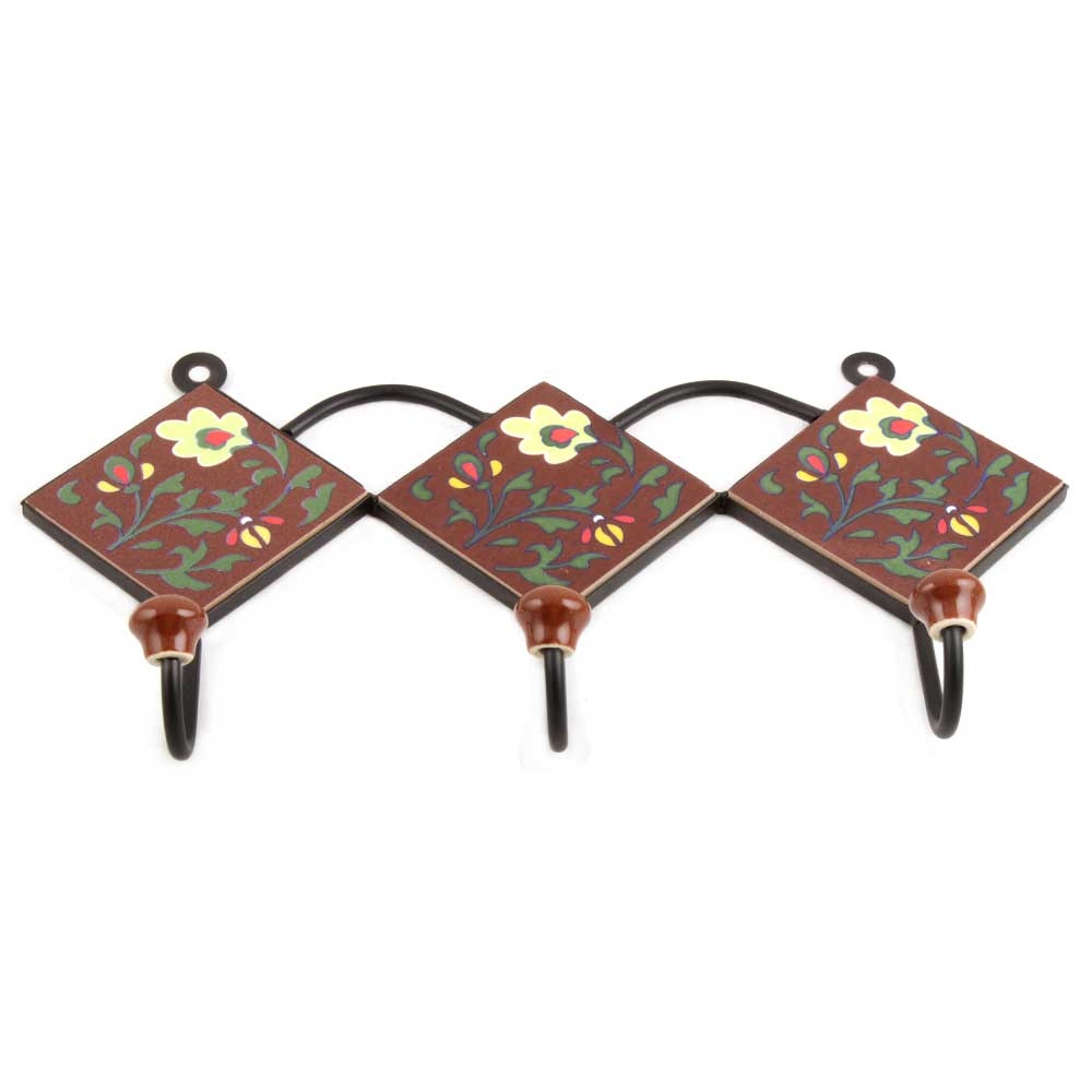 Brown Light Yellow Floral Tiles Hook. When Put on Wall or Cabinet It is An Art in Itself. the Metal Part of This Hook is Black Powder Coated.