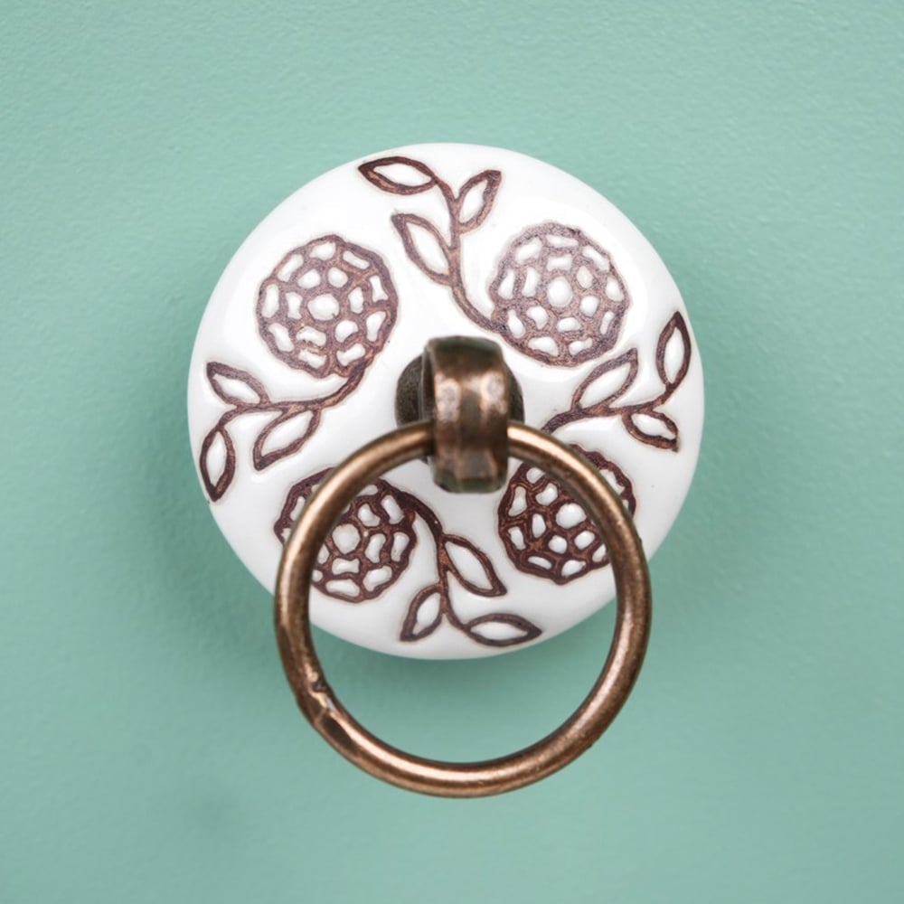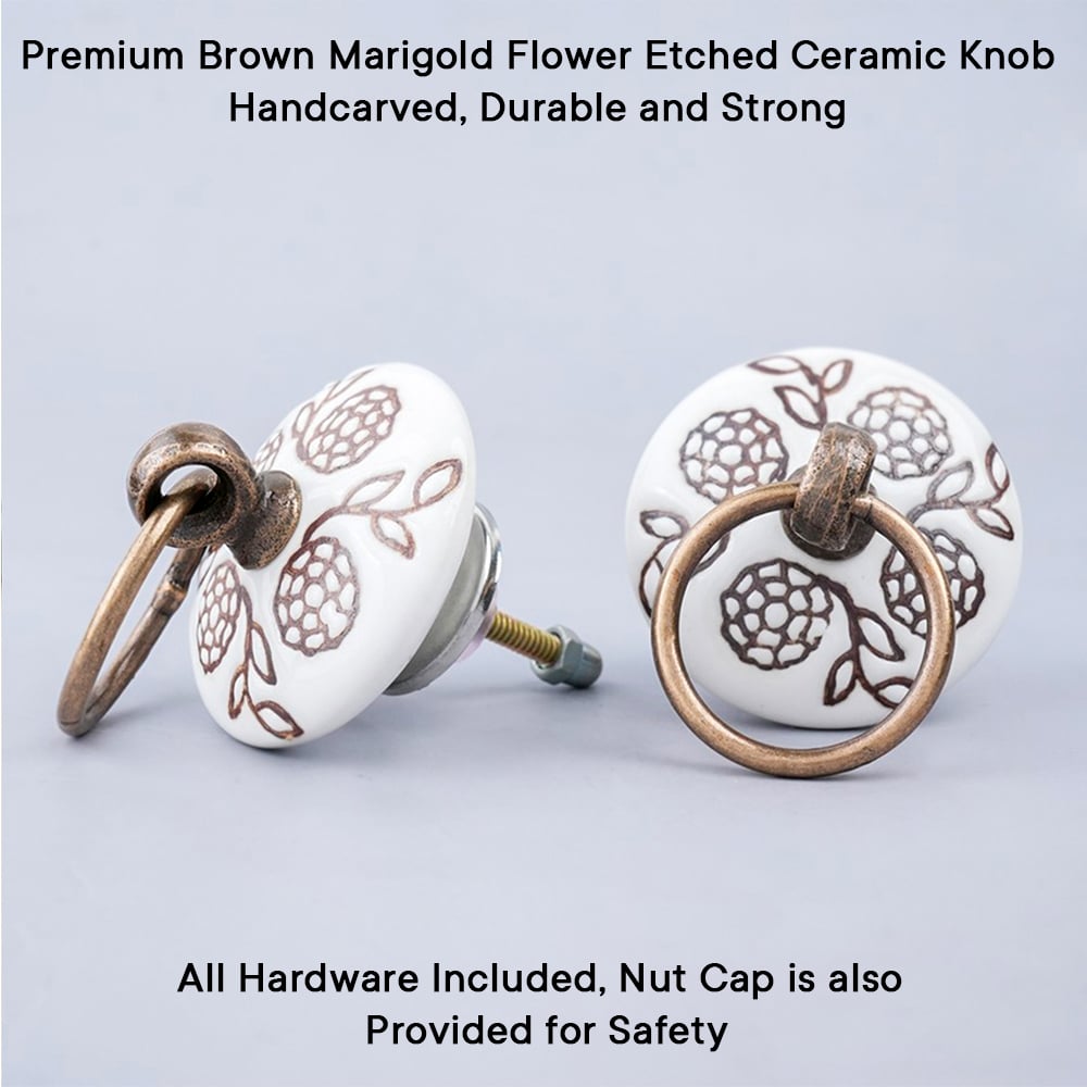 The Brown Marigold Flower Etched Big Ceramic Flat Drawer Knob is carefully crafted with intricate attention to detail. The rich brown color provides a warm, earthy tone that blends seamlessly with various décor styles, from rustic to modern. The marigold flower motif adds a soft, organic touch, making this knob a perfect addition to any room where you want to add both elegance and a hint of nature-inspired charm.