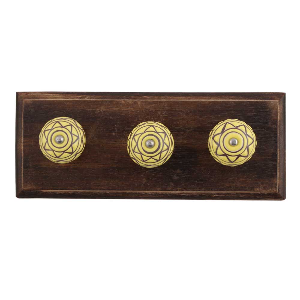 Brown Pattern Etched Ceramic Wooden Hook. A Perfect Complement to the Soft Tone of the Wood are these White Traditional Hat & Coat Hook Made of Genuine Porcelain and Brass. It can be use to Hang Jewellery, Leashes, Towels, Scarves, Light Weight Sweaters, Caps Etc.