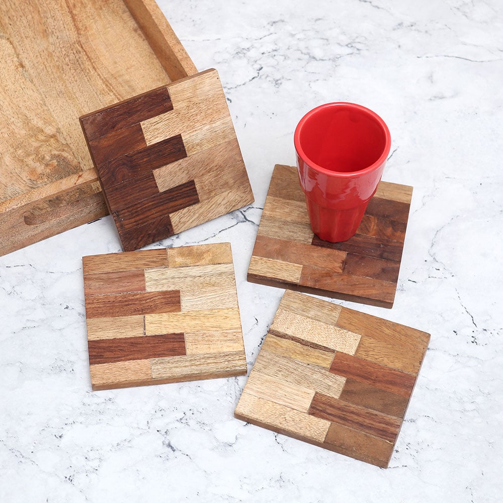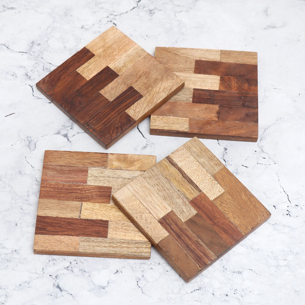 Buy a Pack of four wooden coasters online that is handcrafted with precision and artistry by highly skilled and experienced Indian artisans. These wooden coaster sets are crafted from the finest quality wood, ensuring durability and elegance in every piece. With their square shape and vintage-style design, they add a touch of sophistication to any space, making them a perfect decorative item for your home or office. Each coaster in this wooden tea coaster set features a unique pattern of different shades of brown, enhancing their visual appeal and adding a charming rustic touch. Their sturdy construction makes them suitable for holding water, tea, juice, or coffee glasses, providing a protective barrier against unwanted stains on your surfaces. These wooden coasters are versatile and suitable for various settings, including homes, offices, restaurants, hotels, and cafes. Additionally, they make for an excellent gift option for your loved fours on special or festive occasions.