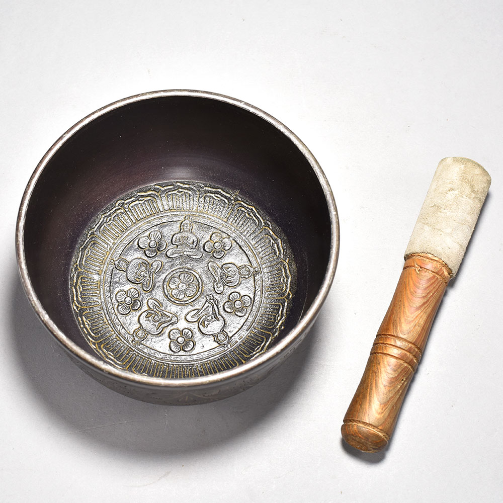 Unlock the secrets of ancient Tibetan wisdom with this stunning Buddha floral carved Singing Om bowl.Immerse yourself in the calming vibrations of this Tibetan singing bowl and let the stresses of the day melt away. Crafted with centuries-old techniques, this beautiful bowl is a portal to inner peace and mindfulness. Whether you're an experienced meditator or simply seeking a moment of tranquility, this singing bowl will transform your space into a sanctuary of serenity. This Singing Om bowl makes the perfect addition to any wellness routine. Its captivating design and resonant tone create the ideal environment for deep relaxation, stress relief, and sound healing. Elevate your meditation practice, lull yourself to sleep, or simply bask in the bowl's soothing vibrations - this versatile piece will become an indispensable tool for your journey to greater wellbeing. Handcrafted metal construction with intricate floral and Buddha carvings Produces a rich, soothing tone that promotes deep relaxation and meditation Vibrant hand-painted designs and Tibetan mantras for added spiritual energy Wooden striker included for effortless sound therapy sessions