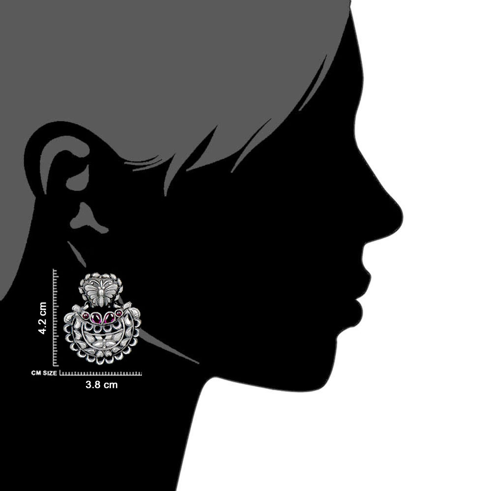 A very intricate 92.5 Sterling Silver Chandbali Earrings has a butterfly engraved on the stud with intricate leaves on the bali and fuchsia jade stone adding pops of pink color to the oxidized earrings. A perfect accessory for weddings, valentines, birthdays and for your date . Great gift for your beloved or near and dear ones.