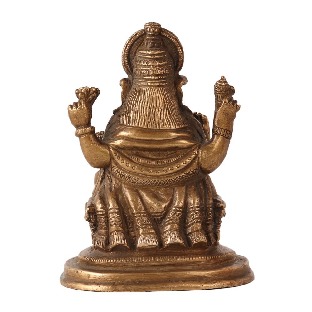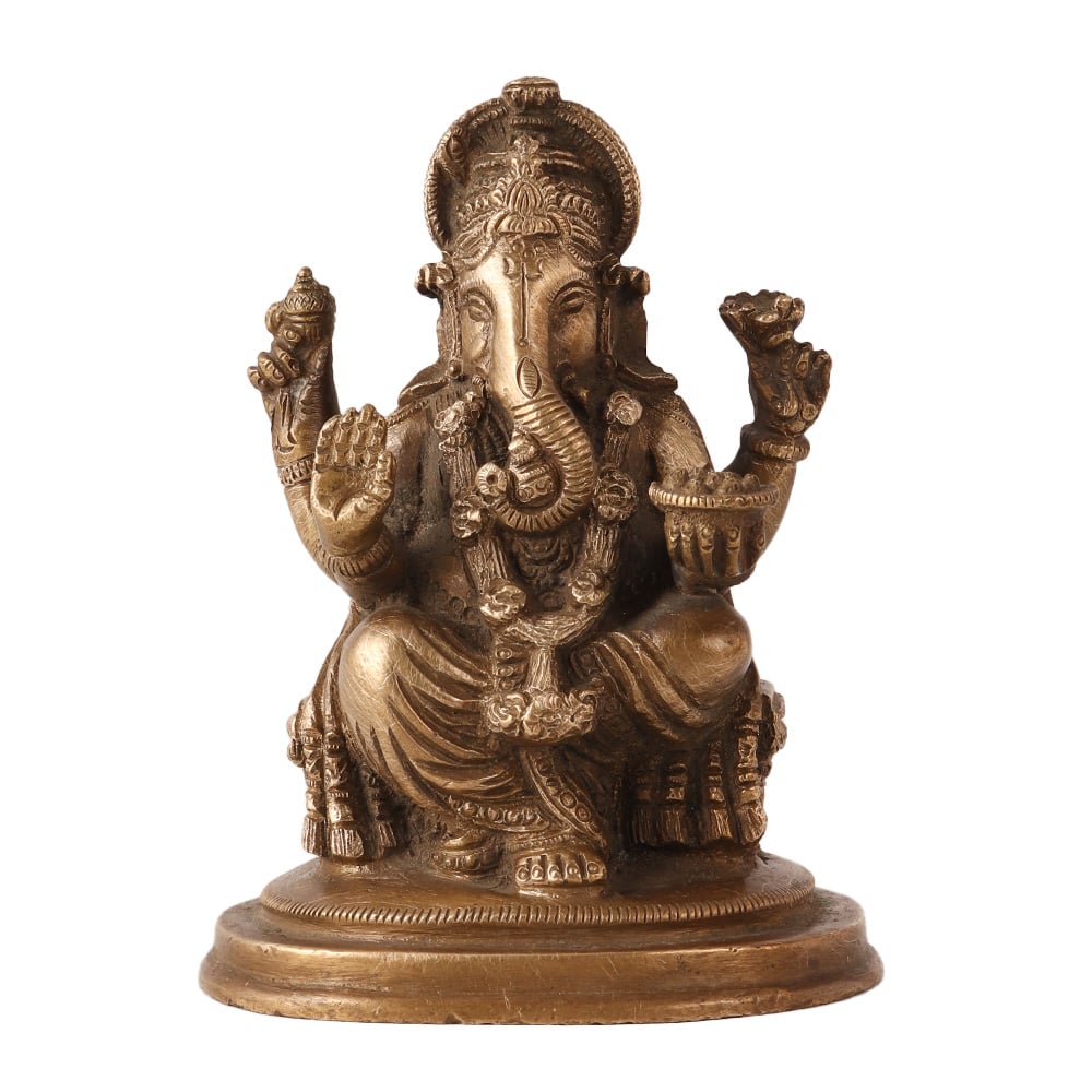 Buy Brass Statue Online Of Lord Ganesha. This is a magnificent statue of the Hindu deity Lord Ganesha, known as the remover of obstacles and the god of wisdom. This beautiful statue is made of brass and stands at about 8-10 inches tall, making it a perfect size for any home or office. The intricate details and fine craftsmanship of the statue are a testament to the skill of the artisan who created it. The golden finish of the brass gives the statue a warm and inviting aura, making it a wonderful addition to any Hindu shrine or personal altar. Lord Ganesha is depicted in his traditional pose, with his pot belly and elephant head, sitting on a lotus flower and holding his symbol of wisdom, the Akshamala, and his favourite sweet, the Modak. This brass idol is a beautiful representation of Lord Ganesha and a great way to bring positive energy and blessings into any space.
