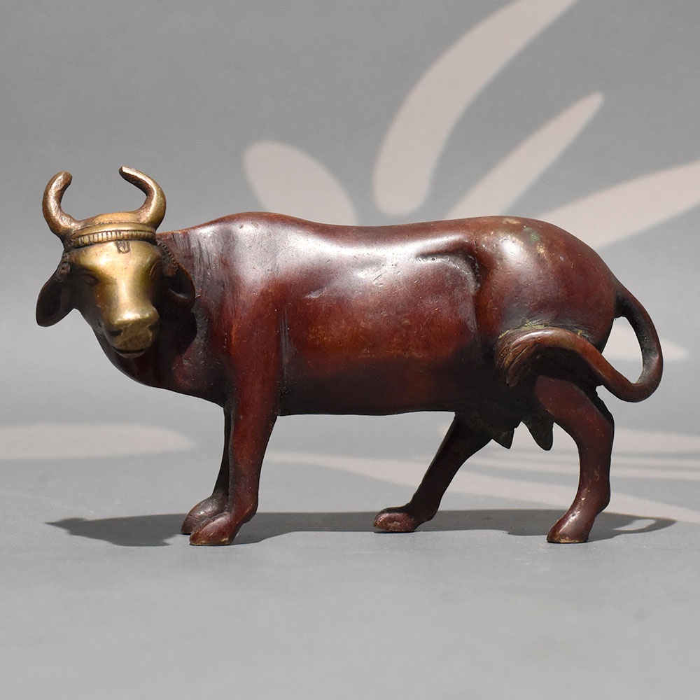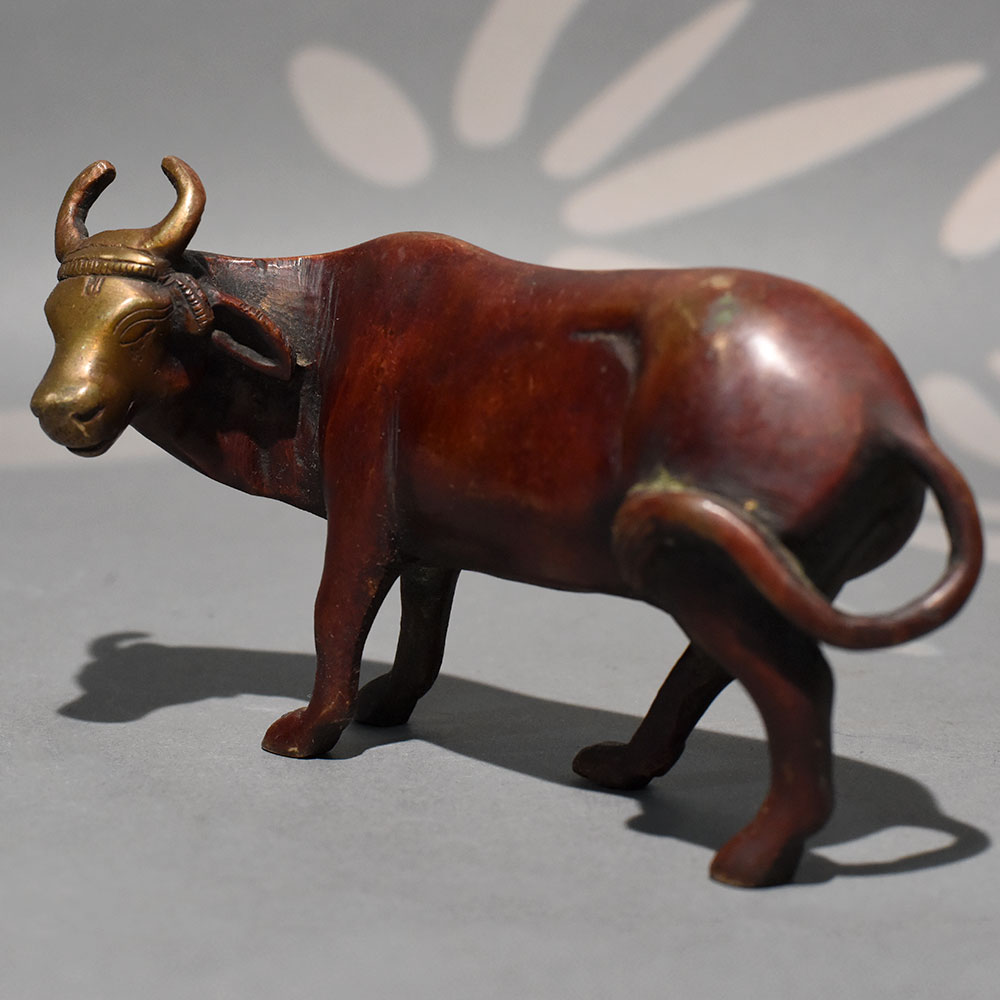 This handmade brass standing Cow sculpture represents strength, stability, and grounded energy through refined metal craftsmanship. Sculpted in a poised walking stance with a lifted head and curved horns, the figure conveys quiet power and forward movement. The elongated body proportions and clean contours create a balanced silhouette that stands out as a bold decorative accent. The sculpture features a dual-tone finish, combining warm earthy brown hues across the body with contrasting golden highlights on the face and horns. This subtle color variation enhances depth and gives the piece a vintage-inspired character. Cast using traditional techniques, the handcrafted brass structure showcases smooth detailing along the torso, legs, and tail, while maintaining a minimalist yet expressive design. In many cultures, the Cow symbolizes prosperity, resilience, and determination. This decorative figurine can be placed in living rooms, office desks, entry consoles, or heritage-themed interiors to introduce symbolic meaning along with artistic presence. Its horizontal form makes it ideal for shelf styling, cabinet displays, or curated collectible arrangements. The solid brass construction ensures durability and long-lasting finish retention. Slight natural variations in tone reflect its handmade origin, making each sculpture uniquely distinct.