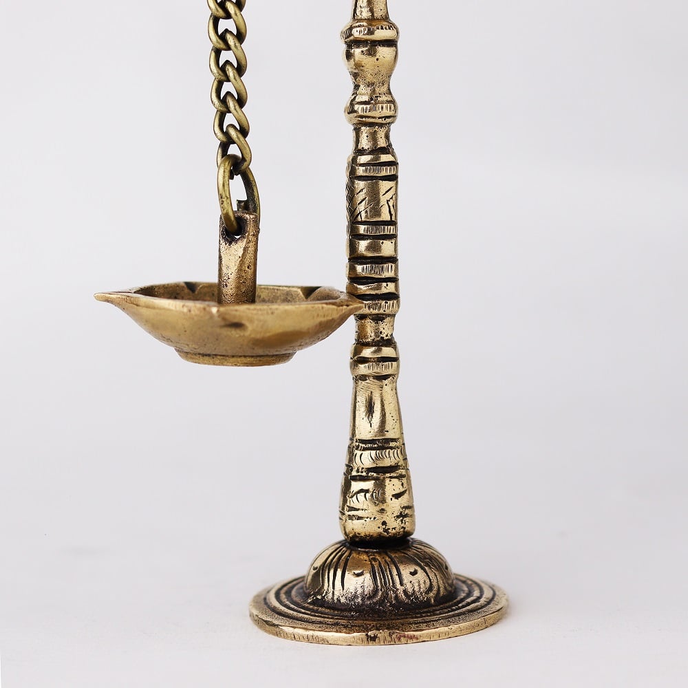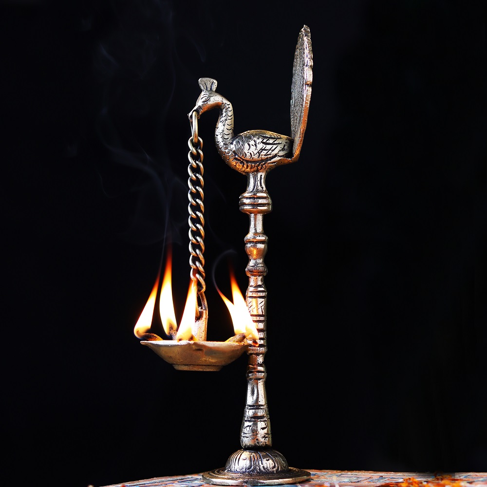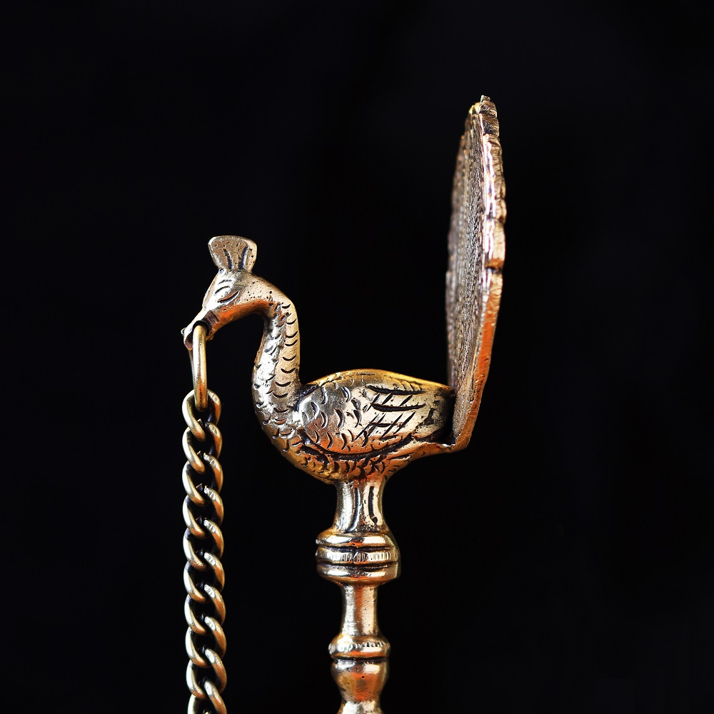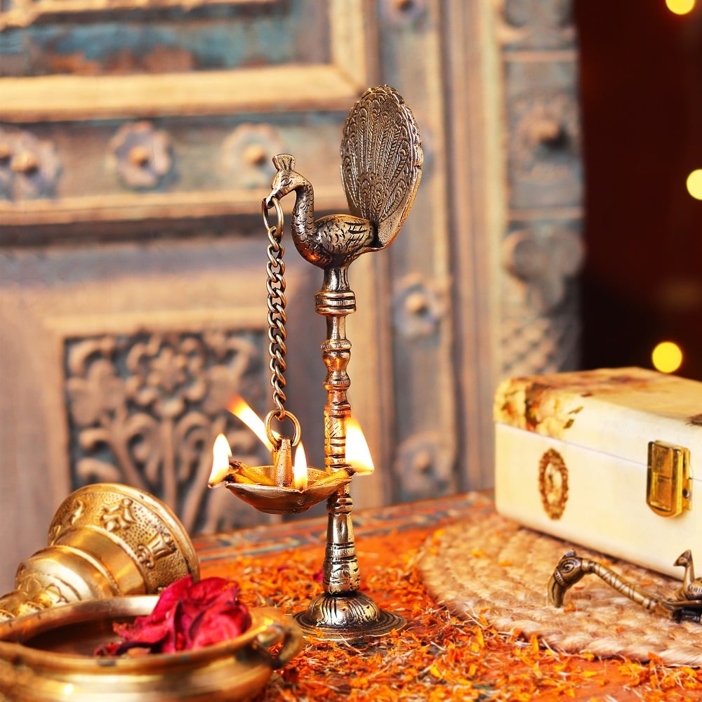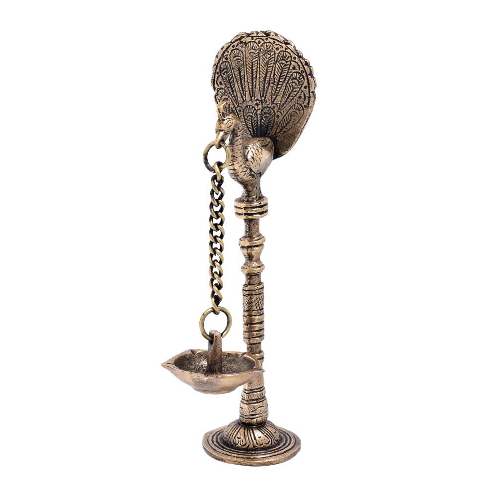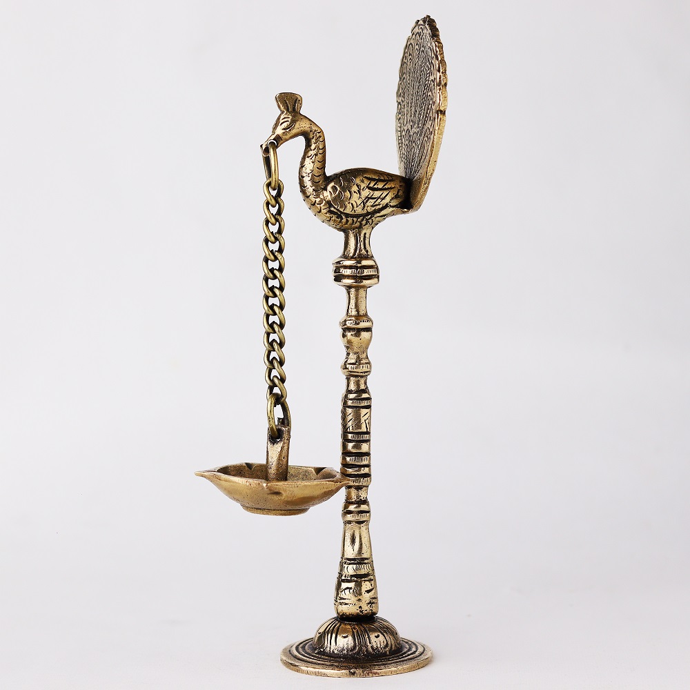 A brass peacock with hanging diya Diwali light lamp is a unique and intricate piece of art that symbolizes prosperity, happiness, and good luck. The brass material adds to the overall beauty of the statue, while the presence of a parrot, a highly intelligent and colorful bird, adds to its aesthetic appeal. The parrot is often seen as a symbol of good fortune, while the diya, or oil lamp, symbolizes the light of knowledge and wisdom. The hanging diya brass oil lamp adds a touch of traditional Indian culture to the statue and represents the spiritual significance of the diya in Hinduism. Buy lamps online for your home and offices . This brass statue can be used for decoration or as an offering to the gods during religious ceremonies and prayers. Overall, a brass parrot with hanging diya is a beautiful and meaningful piece of art that adds charm and elegance to any space.